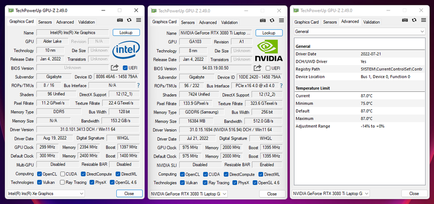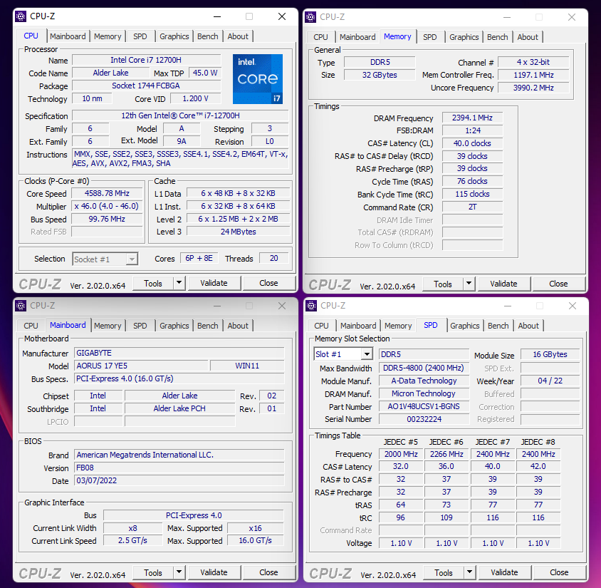 Весь модельный ряд текущего поколения ноутбуков AORUS 17 основан на базе процессора Core i7-12700H. Разница комплектаций заключается в объёме оперативной памяти, видеокарте и объёме твердотельного накопителя. Изучаемый образец характерен 32 ГБ DDR5 памятью (4800 МГц), 1 ТБ Gen4 накопителем и видеокартой RTX 3080 Ti Laptop с TDP до 135 Вт.