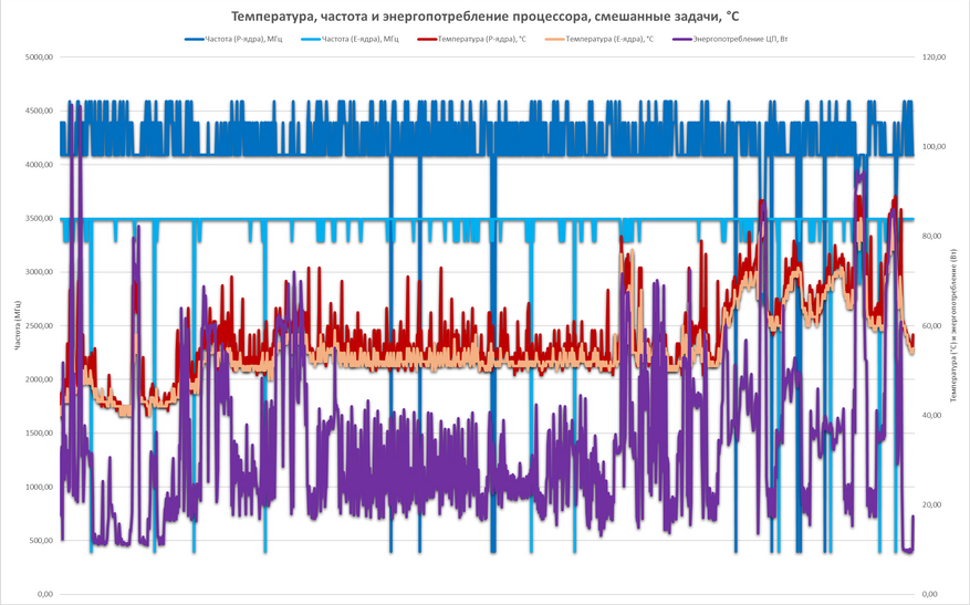 Основная «фишка» процессоров 12-го поколения старших моделей – наличие двух типов ядер. Про работу такой связки материалов в сети великое множество, а вот на график работы такого процессора в конкретном ноутбуке посмотреть интересно.
