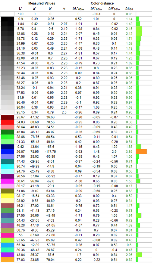 Калибровка, к слову, тоже достаточно хороша – среднее отклонение составило 1.03 при максимальном для единственного цвета 3.86. Такие показатели близки к требованиям даже к профессиональным дисплеям.