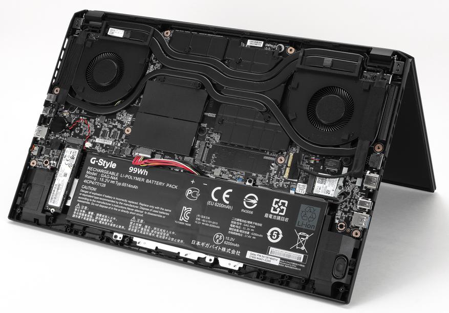 Под нижней крышкой, демонтаж которой лишает пользователя гарантии, скрывается всё, что можно поменять и нельзя. При помощи авторизованного сервисного центра можно заменить модули памяти и твердотельный накопитель, а также добавить ещё один твердотельный накопитель. Модуль беспроводной связи тоже является съёмным. Система охлаждения представляет собой единую конструкцию из набора тепловых трубок и теплораспределительных пластин. Четыре набора алюминиевых рёбер продуваются парой вентиляторов.