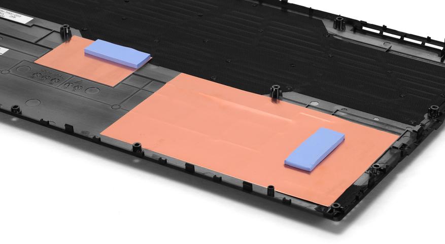 Так как твердотельный накопитель греется довольно сильно (Gen4 с соответствующими скоростями), то тепло от него надо как-то отводить. Эта задача возложена всё на эту же съёмную крышку, но между ней и накопителем находится достаточно толстая термопрокладка. Если надумаете установить ещё один накопитель, то термопрокладка для него тоже есть – она уже установлена в нужном месте.