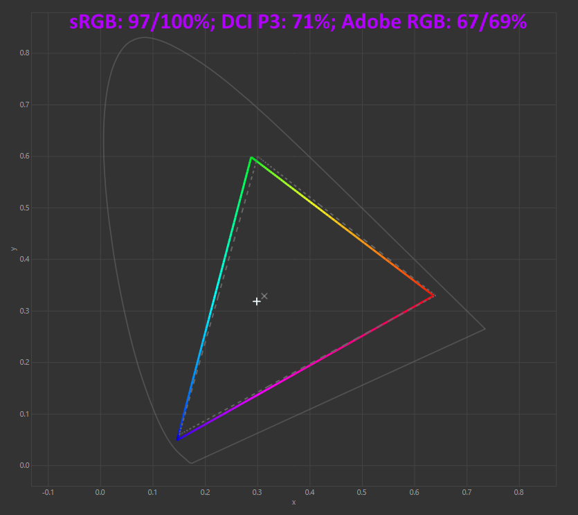 По цветовым охватам производитель не обманул (с учётом некоторой погрешности измерений). Здесь всё хорошо.