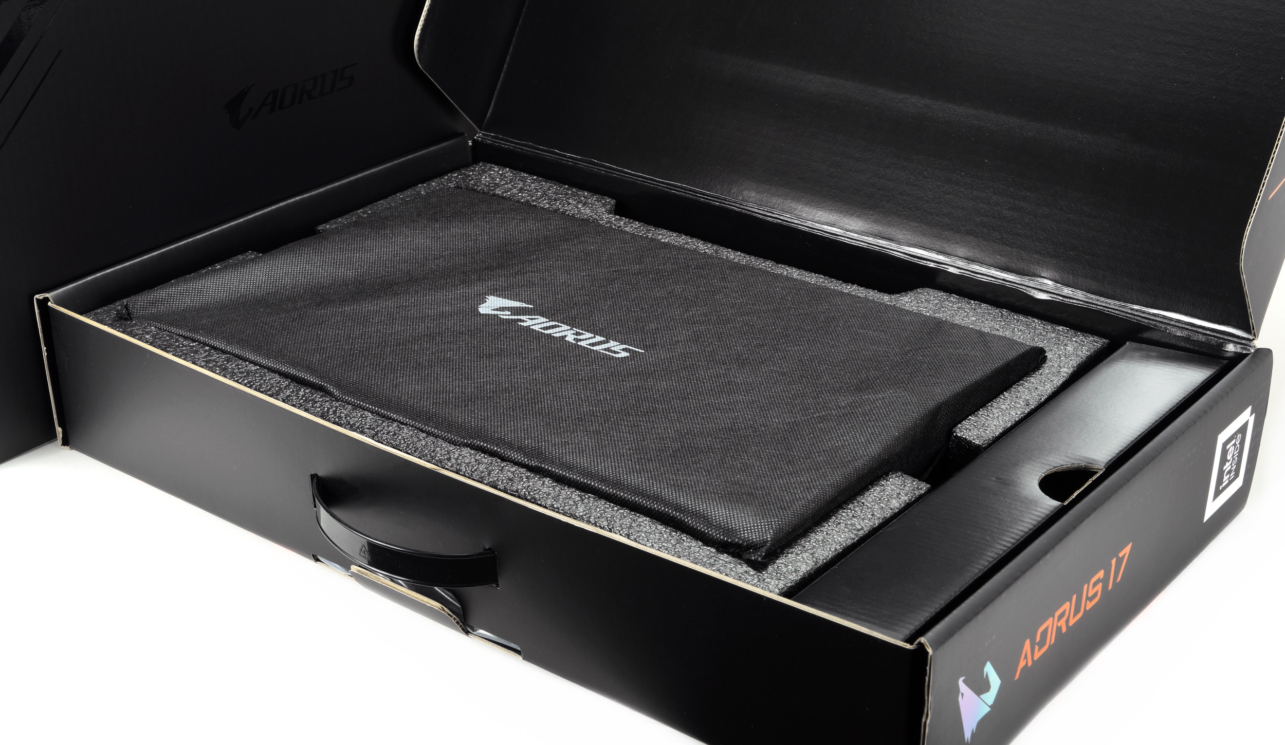 Ноутбуки AORUS 17 поставляются в одинаковых коробках. А точнее – в двух. Первая – защитная картонная, а вторая, расположенная внутри первой, оформлена в чёрном цвете. На ней изображён логотип и название производителя и абстрактный рисунок оранжевого и белого цветов.