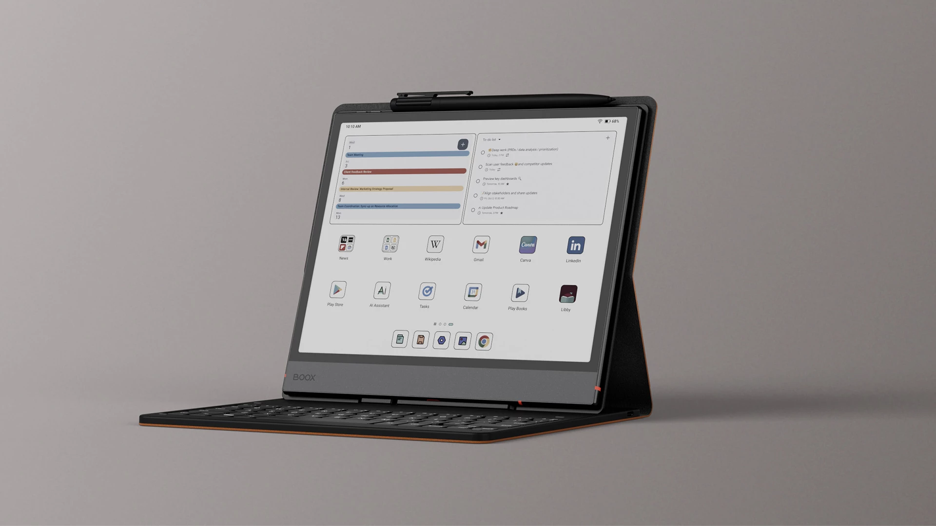 В комплект входит стилус Pen3 с магнитным креплением к корпусу блокнота. Внутри колпачка стилуса размещены запасные наконечники. Отдельно предлагается чехол с клавиатурой, который соединяется с планшетом через пружинные контакты. Режим разделенного экрана и инструменты Smart Scribe на основе искусственного интеллекта обрабатывают рукописный текст и наброски.