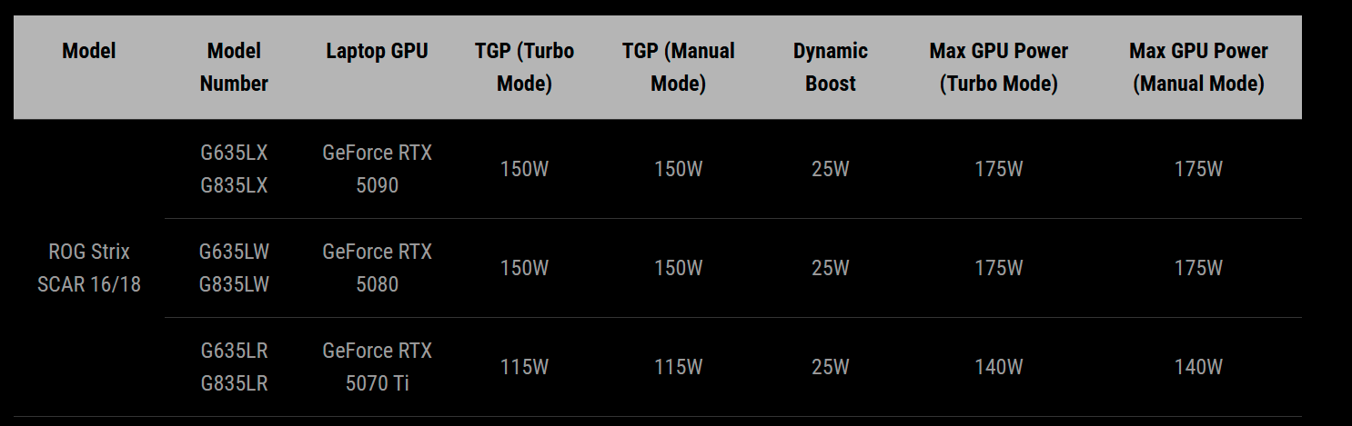 ASUS стал первым производителем, который опубликовал детальные характеристики энергопотребления для всей линейки игровых ноутбуков 2025 года, оснащенных мобильными видеокартами NVIDIA GeForce RTX 5000-й серии. Это решение направлено на повышение прозрачности для потребителей, которые часто сталкиваются с трудностями при определении реальной производительности GPU из-за скрытых или неточных спецификаций TGP (Total Graphics Power).