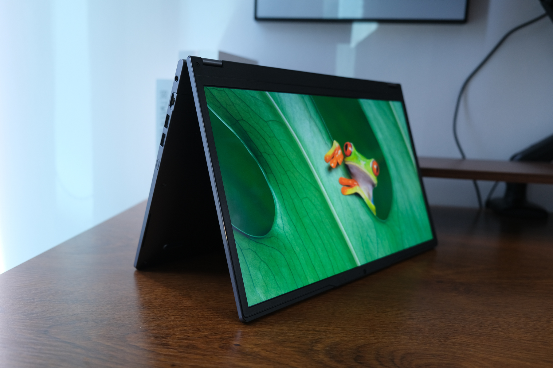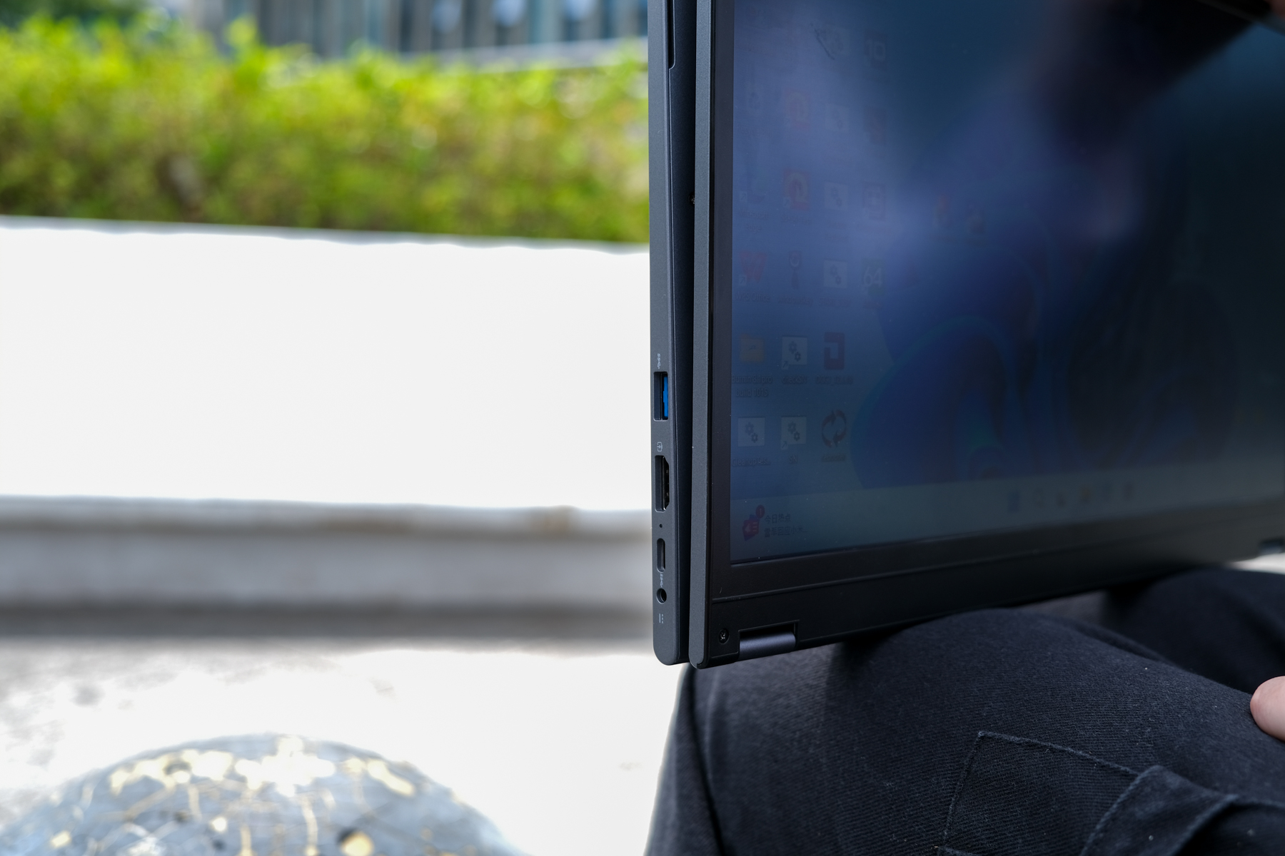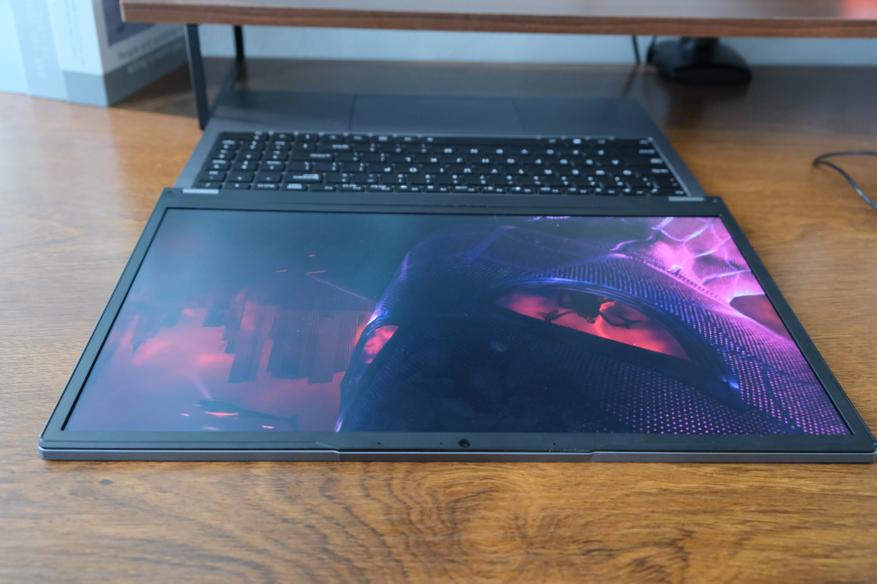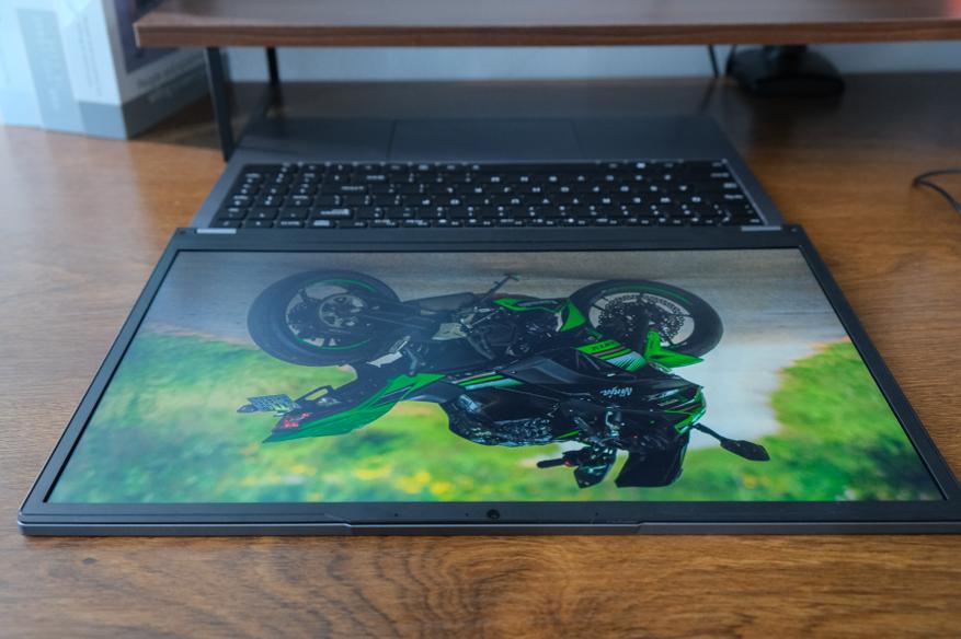 То есть просто открываем ноутбук на 360 градусов и перед нами большой планшет на Windows с 15.6 экраном. Естественно тут есть датчик положения, и исходя из ориентации, экран автоматически поворачивается. Очень удобная реализация, и например если вы вне помещения, но нужно срочно посмотреть какой-либо документ, это можно сделать буквально сидя на ступеньках где угодно.