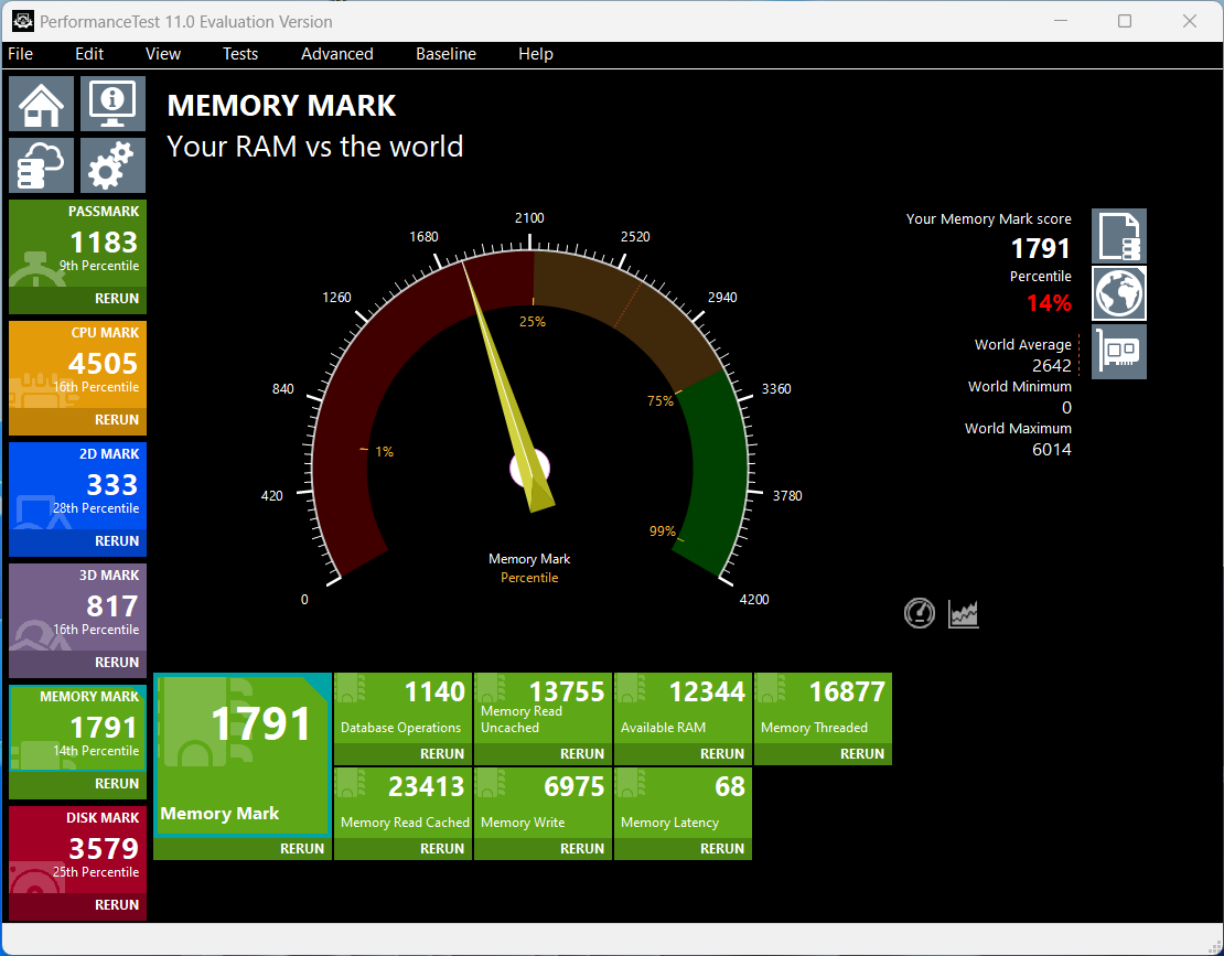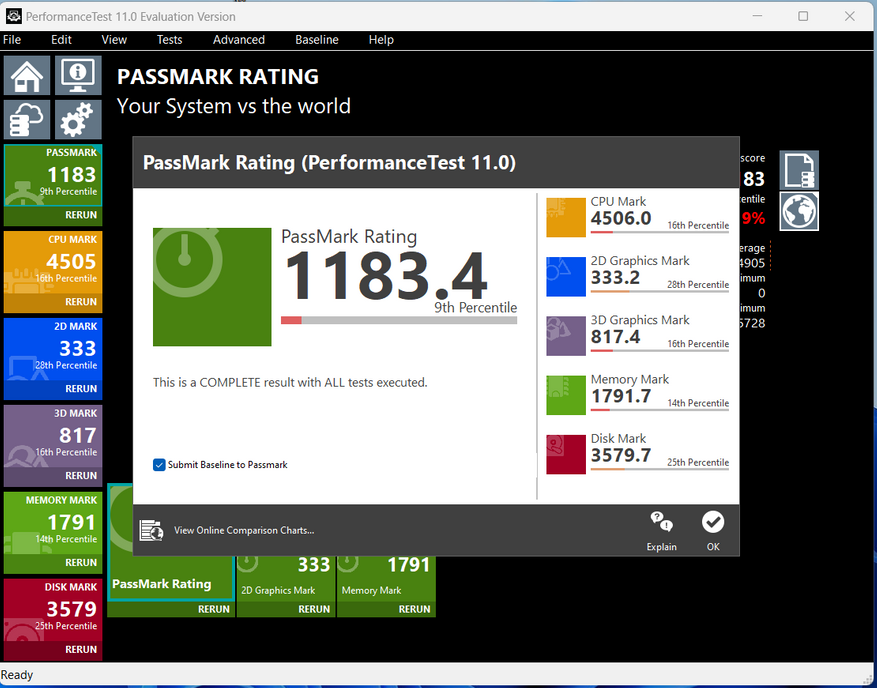 Теперь прогоним общий тест всей системы через PerformanceTest 11 Evaluation Version. Данный тест последовательно проверяет ноутбук по 6 параметрам, и выдаёт итоговую оценку (но каждый параметр также можно проверить)