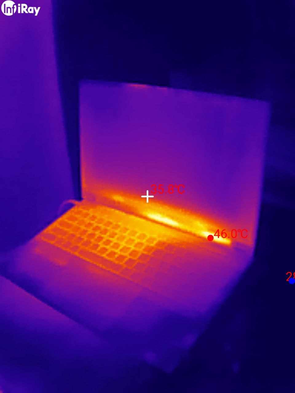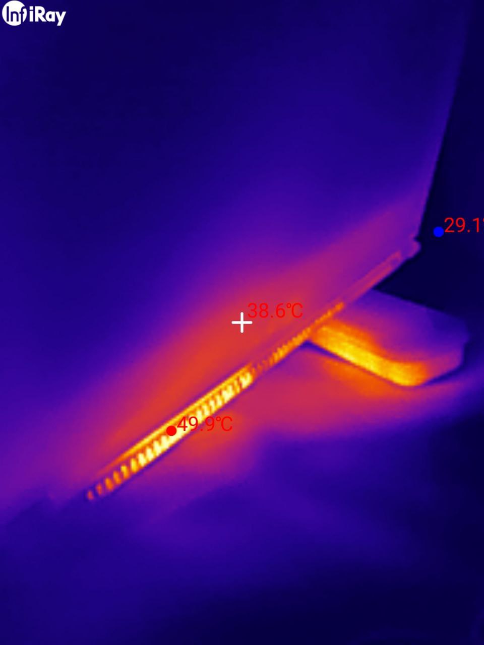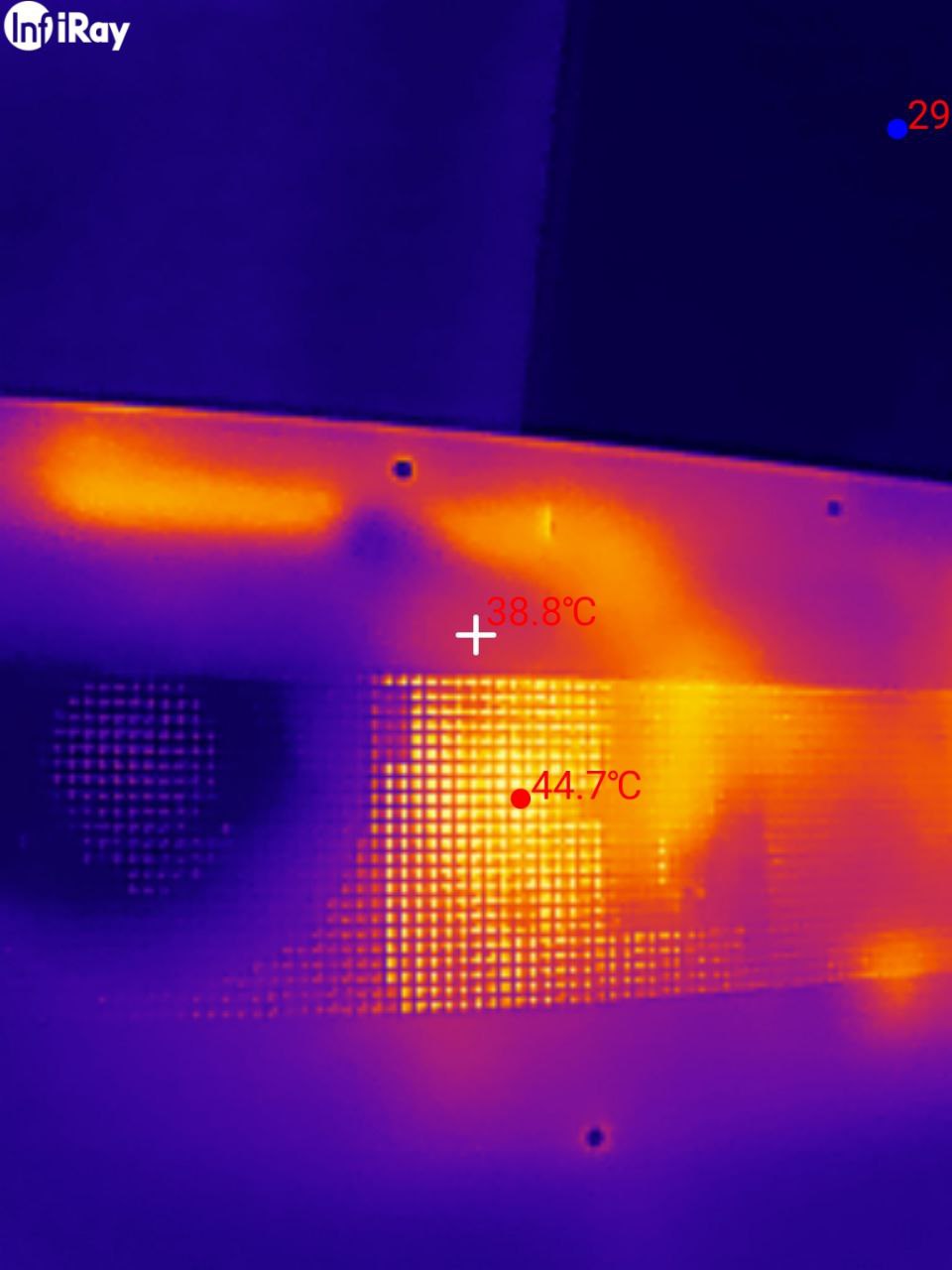 Ну и напоследок фотографии через тепловизор, где видно реальные температуры на корпусе