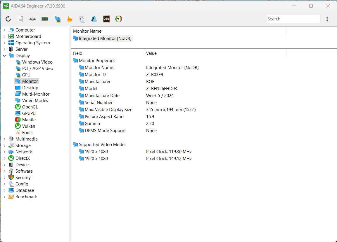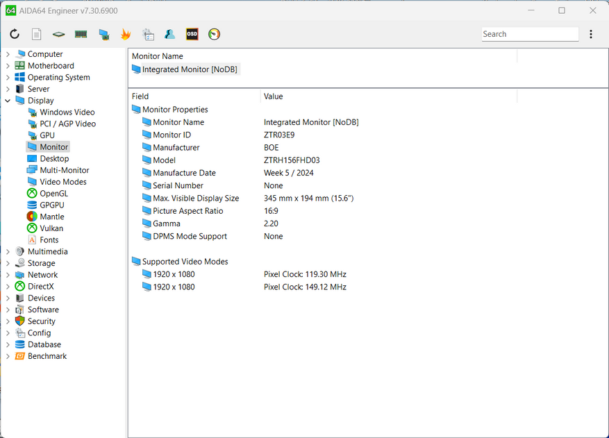 Теперь отдельно про экран. Первым делом информация об установленной матрице. Это BOE ZTRH156FHD03: