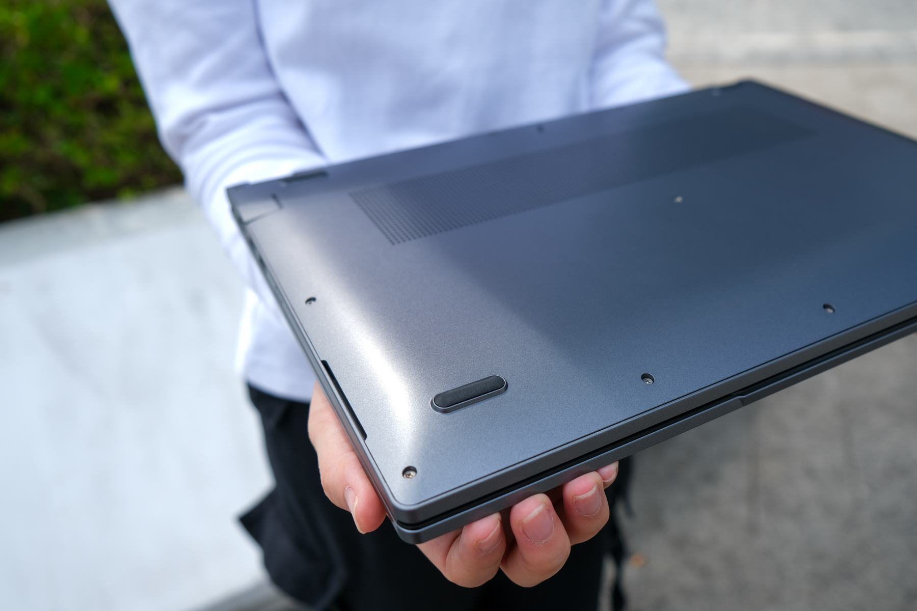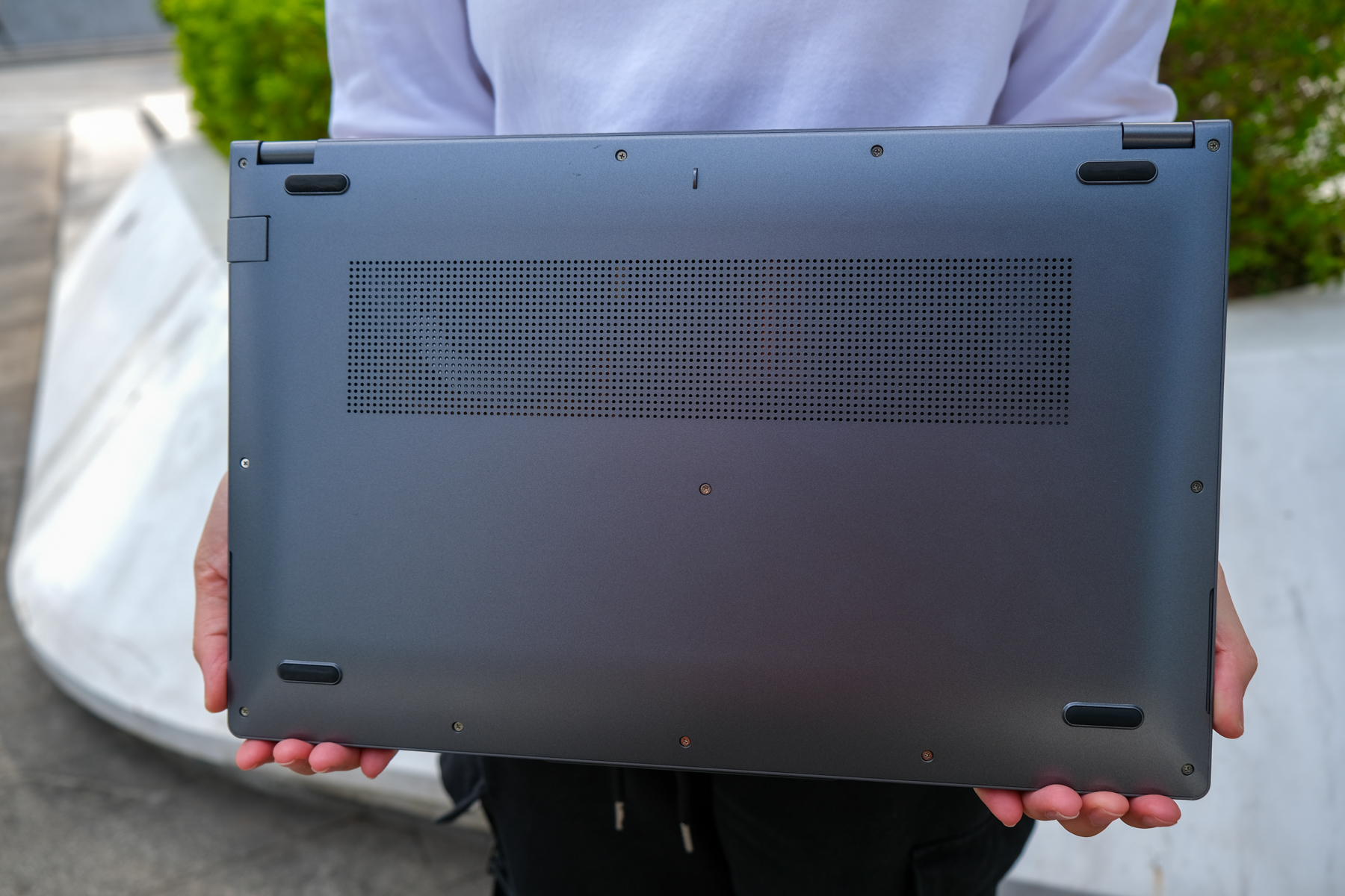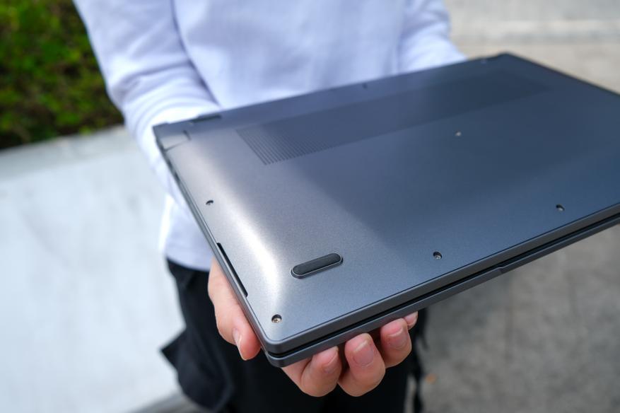 Снизу у ноутбука имеются 4 резиновых ножки для упора и уверенной устойчивости. Также имеется перфорированный воздуховод, для забора воздуха извне