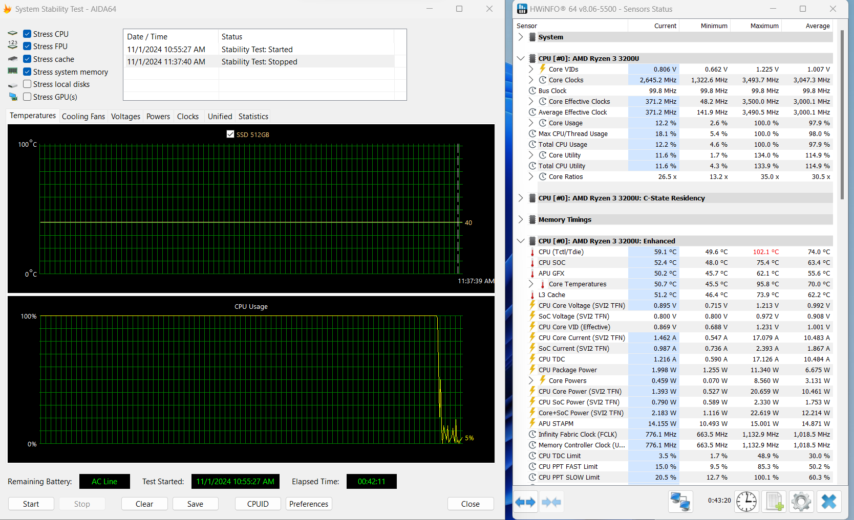 Теперь пришло время стресс-тестам. Как обычно нагружаем процессор ноутбука с помощью AIDA и следим за показаниями с помощью HWinFo