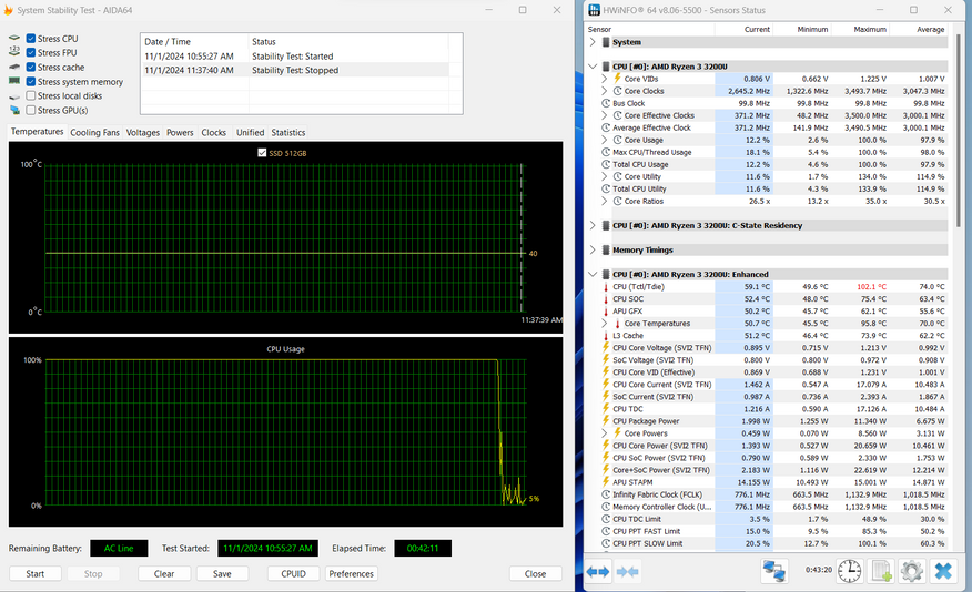Прогон в 40 минут показал что у нас здесь достаточно горячий процессор. На старте даже был пик температуры в 102 градуса, но он был кратковременно, пока не среагировала система охлаждения. В среднем же температура держалась на уровне 74 градусов. Причём это на максимальной нагрузке, и продолжительное время. В обычной жизни ноутбуки редко так сильно нагружаются. Также видно, что TDP тут действительно 15W и не превышается.