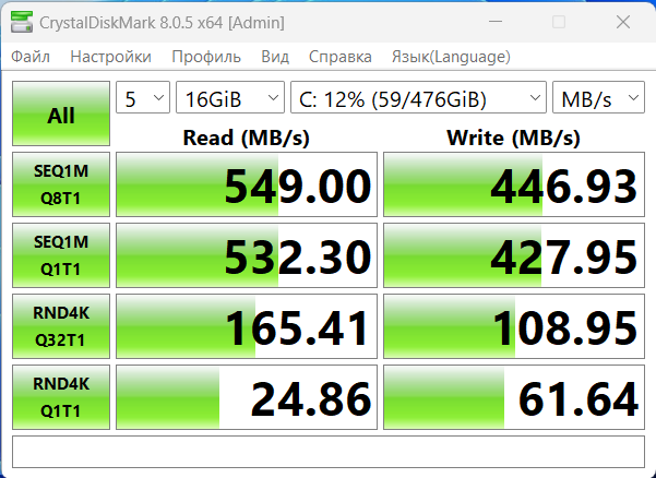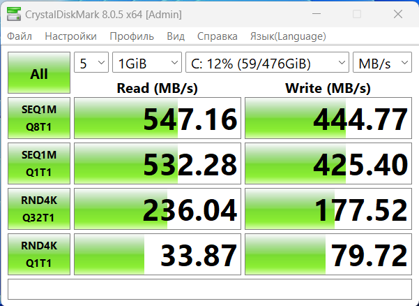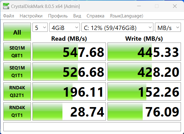 Скорость чтения у установленного диска в среднем 547MB/s, а скорость записи 445 MB/s. Стандартные показатели для Sata.