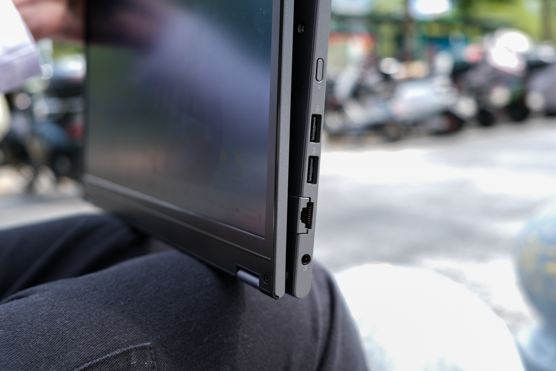 Справа кнопка включения (да, она тут на торце), два USB 2.0, порт RJ45, и разъём для подключения наушников и гарнитуры