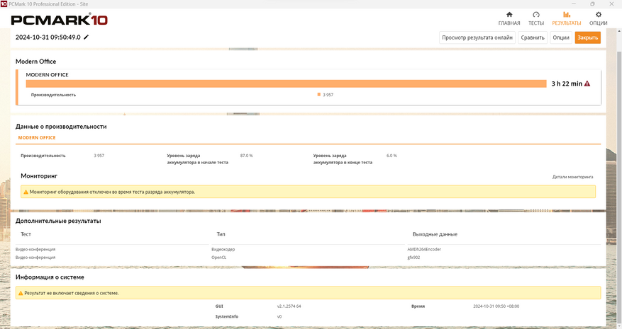 Отдельно прогнал ещё один тест в Pсmark 10 на автономность. Зарядил ноутбук до 87% и оставил разряжаться под нагрузкой в виде обычной офисной нагрузки: редактирование документов, видеоконференции, просмотр браузера и большие таблицы