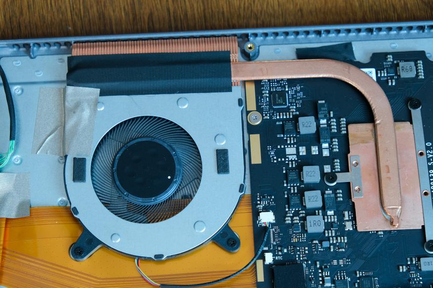 Что касается работы самого процессора, то он здесь прикрыт большой медной теплоёмкой пластиной, от которой идёт одна термотрубка. Которая отдаёт температуру на массивный омедненный радиатор. За обдув отвечает одна турбина, которая довольно производительная. Но шумновата на максимальных оборотах.