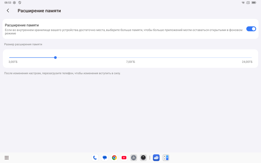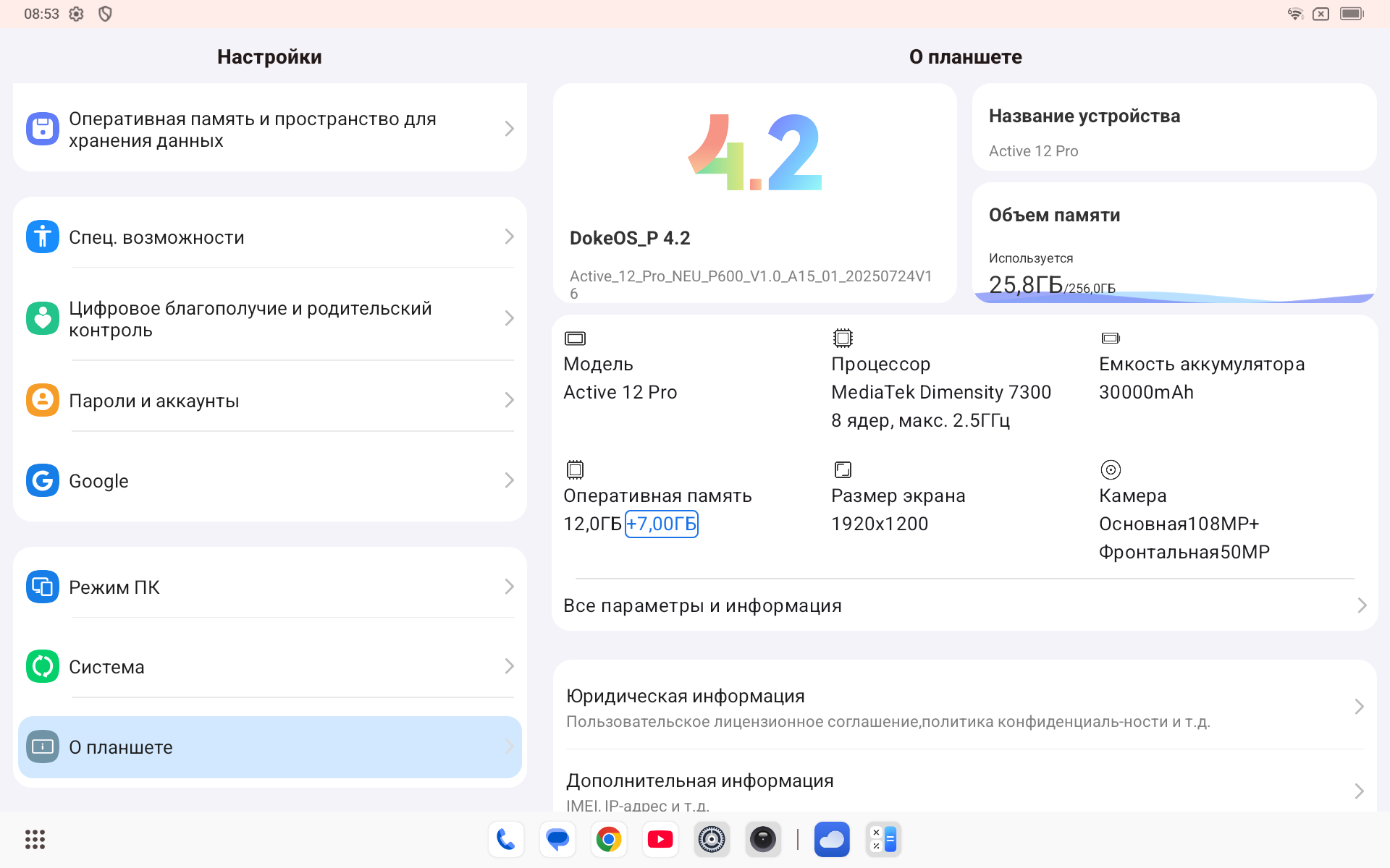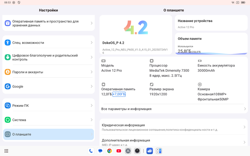 В режиме планшета ничего нового, классические элементы андроида, шторки уведомлений и быстрых инструментов. Изначально на планшете занято 25 ГБ пространства из 258 ГБ. Оперативную память 12 ГБ можно расширить из виртуальной области постоянной памяти.