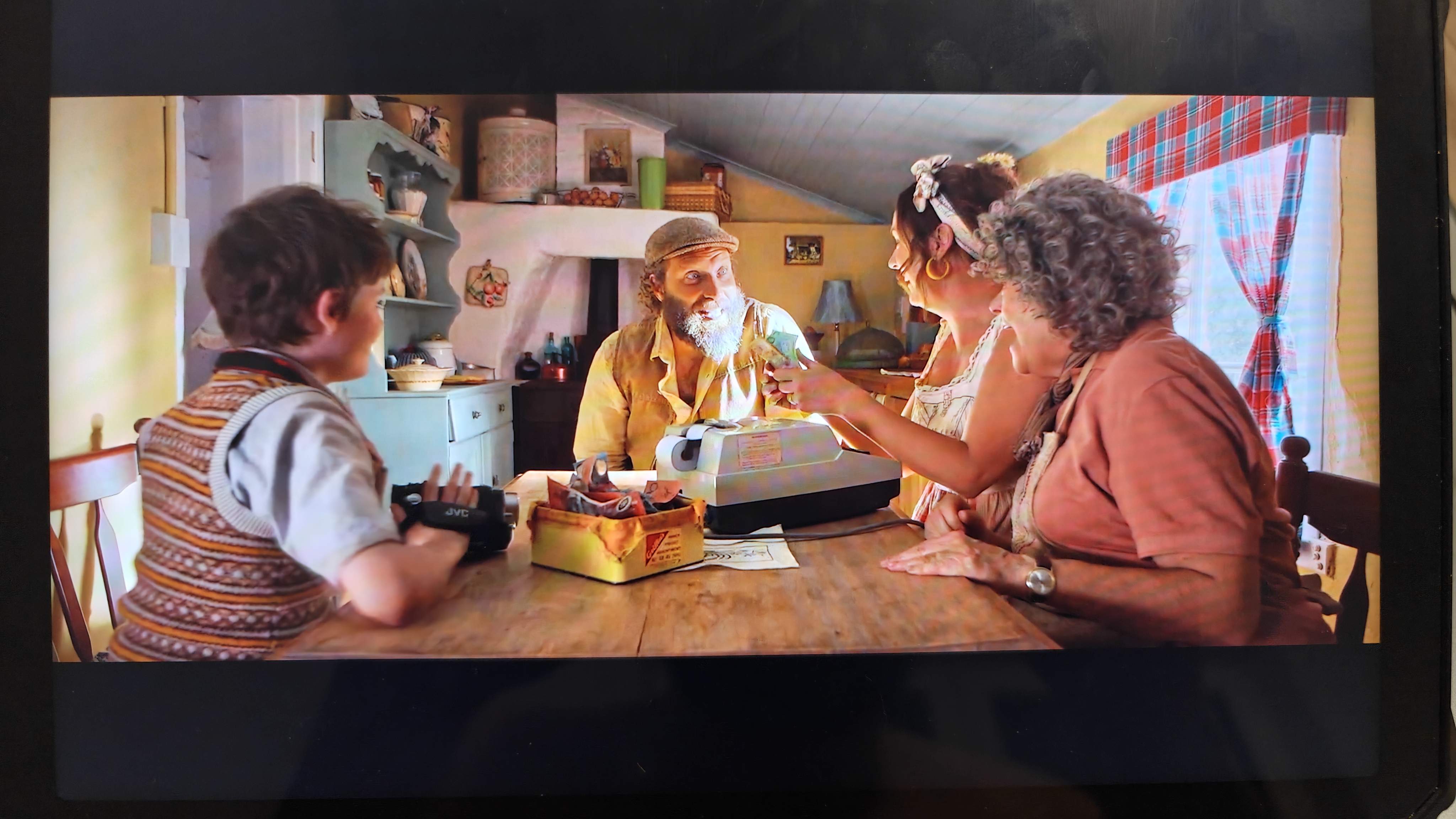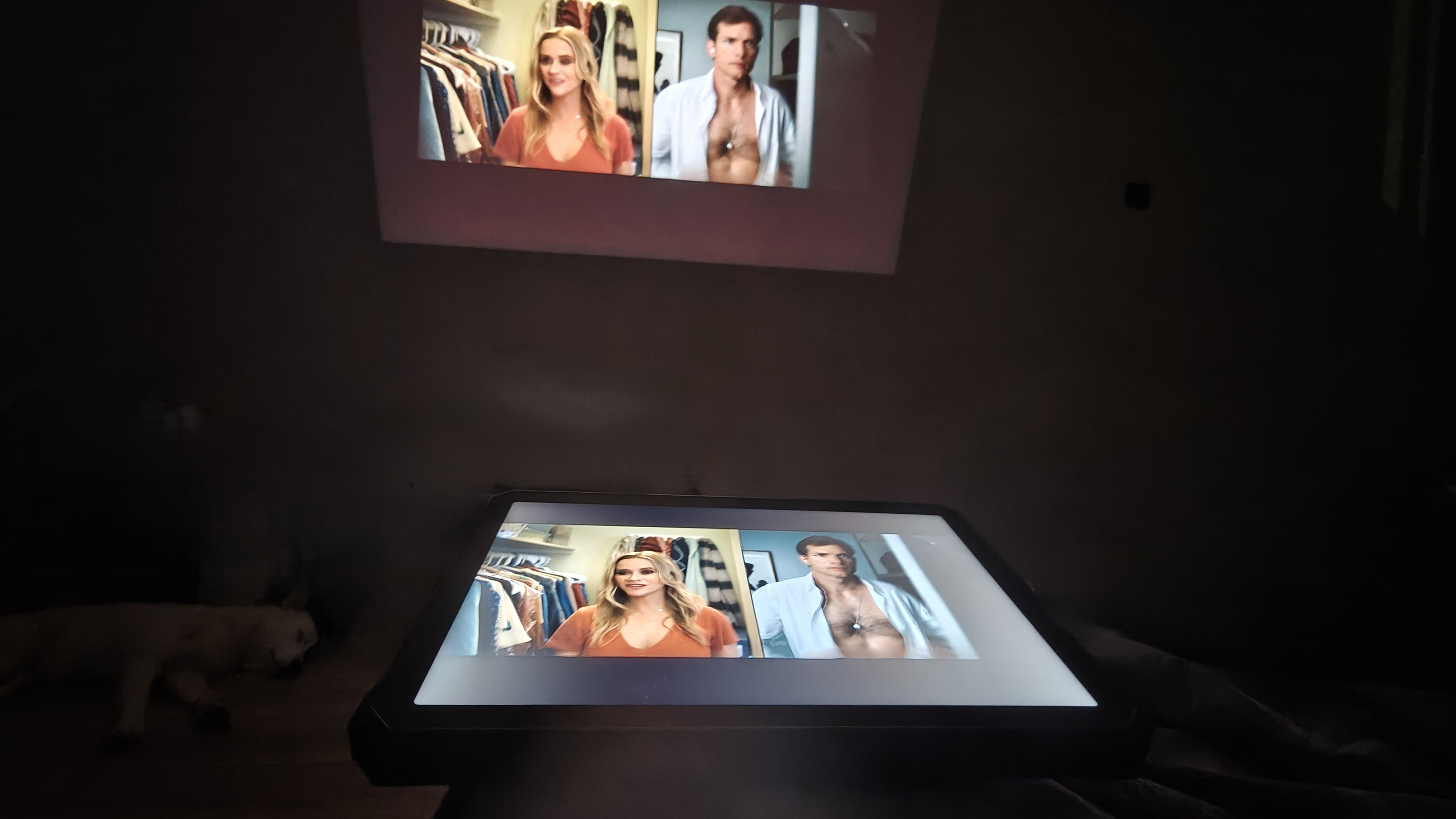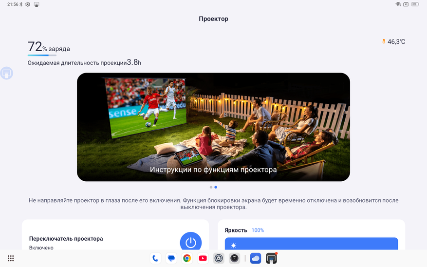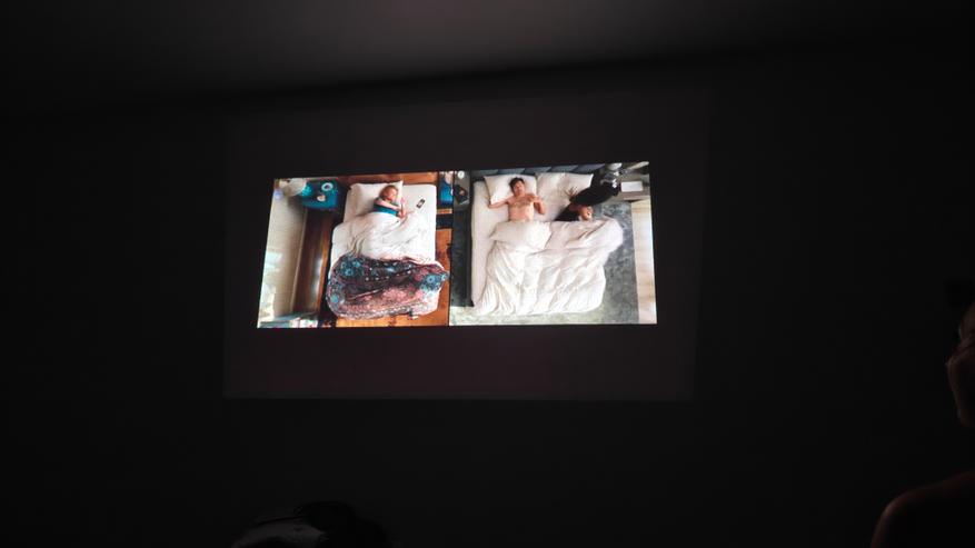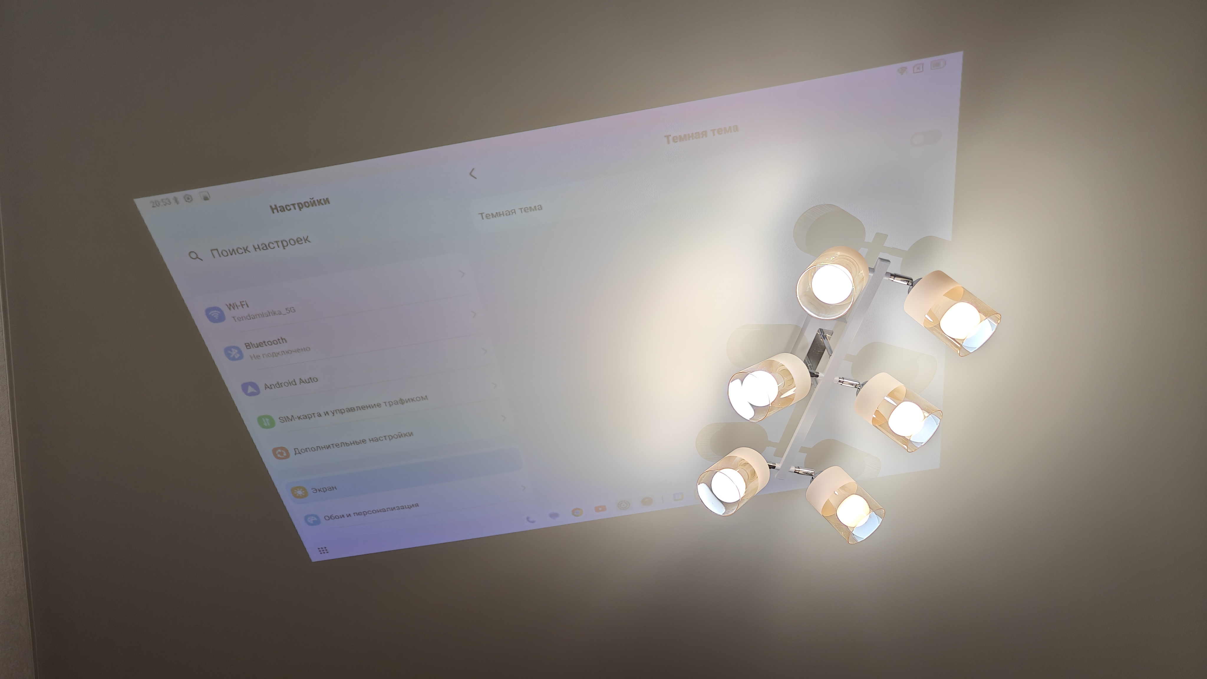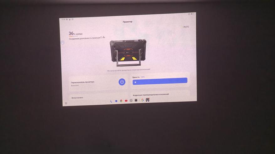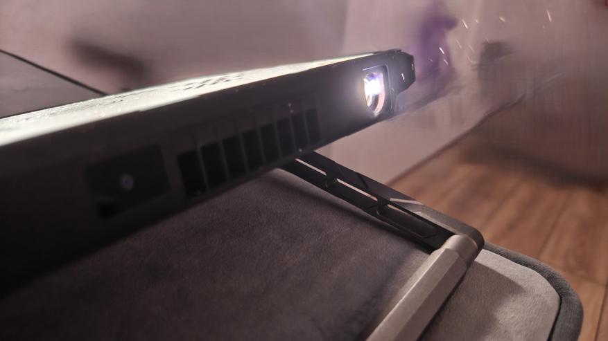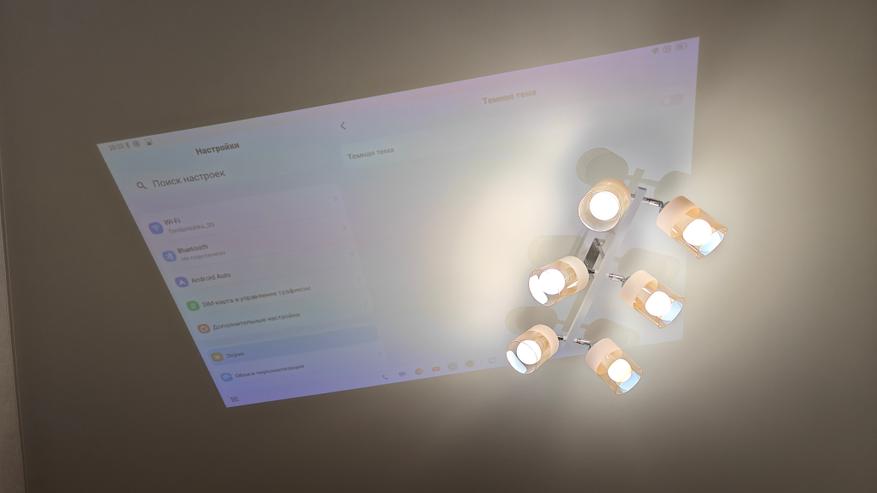 Особенно порадовал встроенный проектор. Неважно где вы находитесь, можно посмотреть любой контент, филmv? показать фотографии, продемонстрировать презентацию. Вообще список вариантов не ограничен. Его яркость 200 люмен, сравнивать с полноценными проекторами, конечно, не стоит, но он очень даже неплох. Вот например, если направить его на потолок при стандартной типовой люстре. Даже так изображение видно. В полной темноте спокойно можно посмотреть фильм.