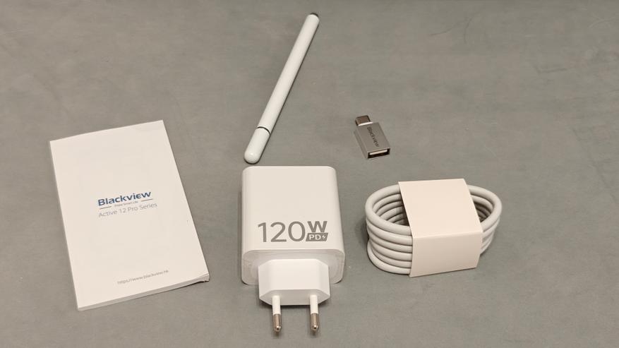 Зарядка мощная на 120Вт, что должно более менее быстро восполнять очень внушительный аккумулятор устройства. Стилус с поворачиваемой головкой, чтобы не царапать стекло дисплея.