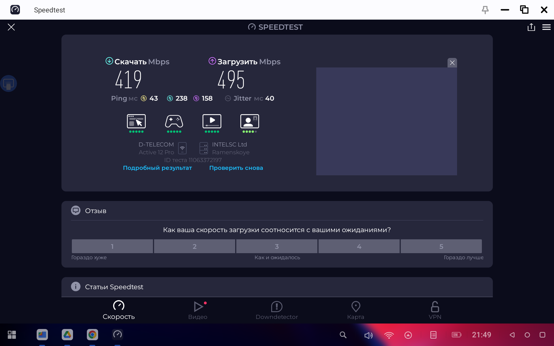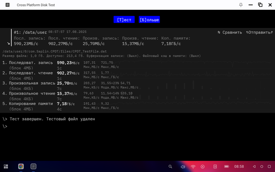Бенчмарк скоростных параметров постоянной памяти показал очень неплохие чипы и измерил скорость на запись 590 МБ/с и около 1 ГБ/с на чтение. Wi-Fi имеет мощный прием, скорость интернета в диапазоне 5 ГГц достигает 500 Мб/с, что очень хорошо.