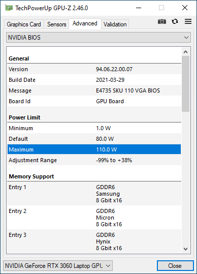 Теперь посмотрим, как установка разных профилей производительности влияет на лимиты энергопотребления для дискретной видеокарты. Ведь Nvidia GeForce RTX 3060 это довольно мощный игровой GPU, но на его производительность сильно влияет настройка в каждой конкретной модели ноутбука. Так, в Machenike F117-7P лимит потребления GPU задан на отметке 110 Вт, в других моделях ноутбуков может быть как менее 80 Вт, так и более 120 Вт. При этом в спецификациях «на бумаге» видеокарта будет одинаковая а вот ее производительность будет существенно отличаться в зависимости от лимитов энергопотребления. Посмотрим, как с этим обстоят дела у детища Machenike: