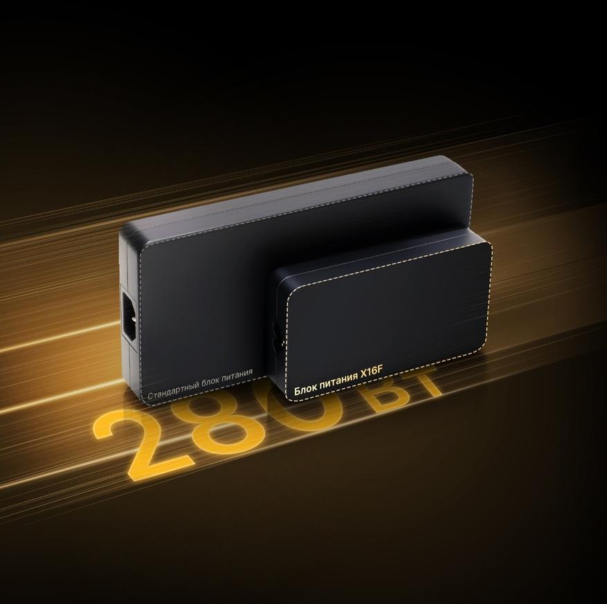 Ноутбук оснащен емким аккумулятором 80 Втч с поддержкой быстрой зарядки. В комплекте идет компактный блок питания на 280 Вт, также предусмотрена зарядка через USB-C мощностью до 140 Вт для большей мобильности.