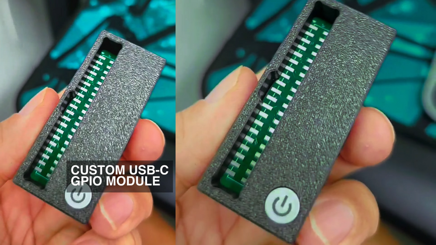 Уникальной особенностью Argon ONE UP является специальный GPIO-модуль, подключаемый сразу к двум портам USB Type-C. Этот фирменный аксессуар предоставляет внешний 40-пиновый GPIO разъем, аналогичный тем, что используются в полноразмерных Raspberry Pi Model B. Модуль имеет собственную кнопку питания и потребляет 5 Вт энергии. Возможность выключения предусмотрена для экономии заряда батареи ноутбука. Подобное решение позволяет сохранить ключевую особенность экосистемы Raspberry Pi — возможность прямого взаимодействия с датчиками, моторами и другими электронными компонентами.