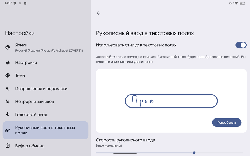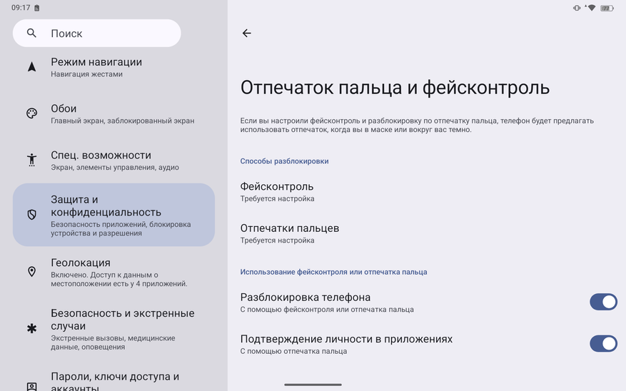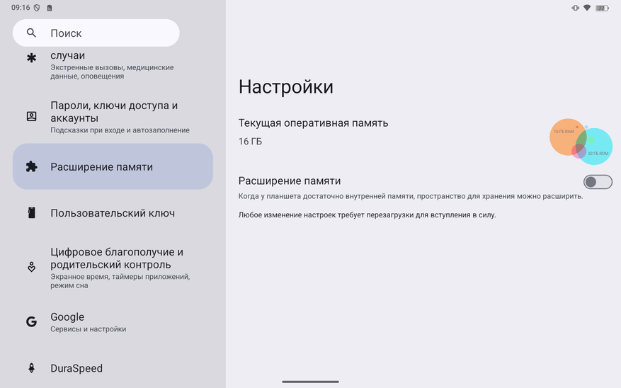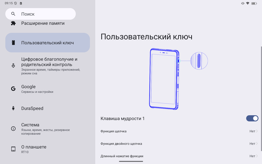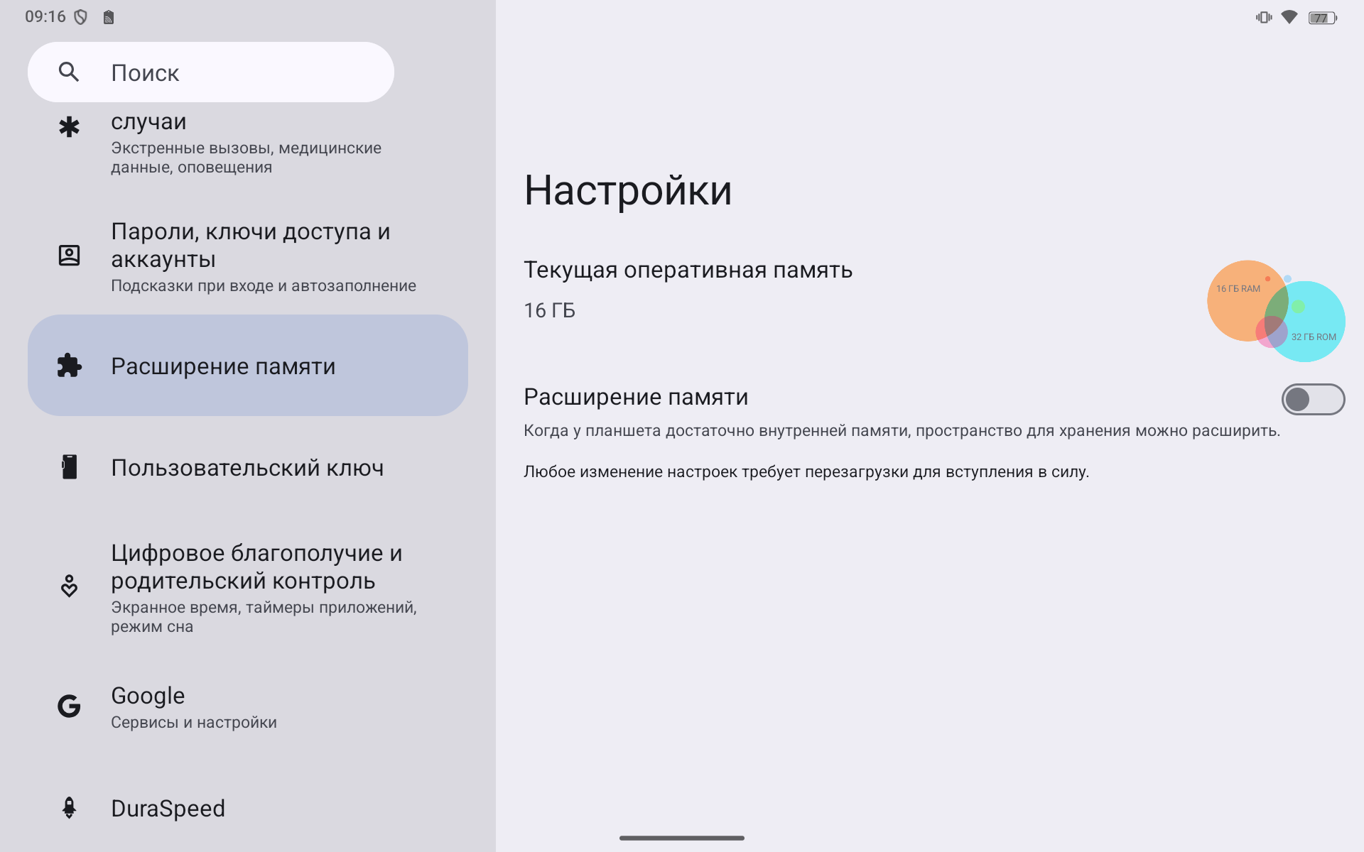 Работает планшет на Android 15. Интерфейс стилизован под так называемую тактическую тематику, что визуально отличает его от стандартных Android-оболочек, но ее можно изменить в настройках. В системе присутствует фирменное приложение DuraSpeed, позволяющее очищать кэш одним касанием, что очень полезно для Android-устройств. Поддерживается виртуальное увеличение ОЗУ, благодаря чему заявленные 48 ГБ оперативной памяти по факту складываются из 16 ГБ физической памяти и файла подкачки. В остальном в настройках все стандартно: можно установить разблокировку по лицу или отпечатку пальца, изменить обои и тему, установить рукописный текстовый ввод и так далее. К минусам отнесу виртуальную клавиатуру, которая нужно постоянно открывать для вывода текста. Открывается она не во весь экран, буквально на 1/4, что тоже неудобно при печати.