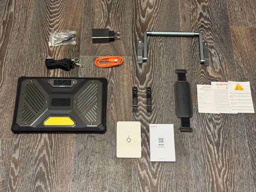 Комплектация у Oukitel RT10 действительно богатая и практичная. Внутри коробки находится сам планшет, зарядный блок мощностью 33 Вт, фирменный кабель USB Type-C с поддержкой быстрой зарядки, документация, отдельная скрепка для извлечения SIM-лотка, а также отвёртка. Помимо этого, в комплекте есть алюминиевая подставка, которая прикручивается к корпусу, несколько крепёжных элементов, дополнительный ремень с карабинами и качественный кожаный ремешок. Качество аксессуаров приятно удивляет, ткань и кожа аккуратно прошиты, всё выполнено добротно и ощущается надёжно.