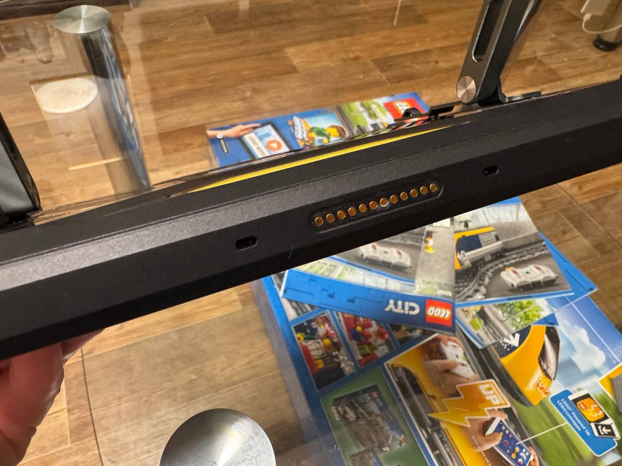 Левая грань полностью пустая. Снизу находятся контакты для подключения клавиатуры. На правой грани под плотной защитной заглушкой размещены порт USB Type-C, разъём AUX и лоток для 2-ух nanoSIM-карт, который извлекается при помощи скрепки. Заглушки сидят очень плотно и создают ощущение хорошей защиты от влаги и пыли.