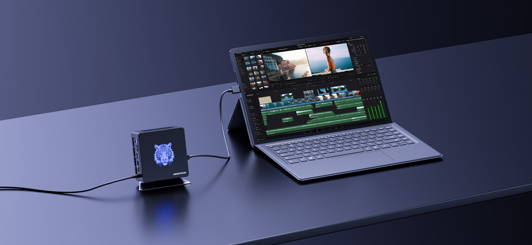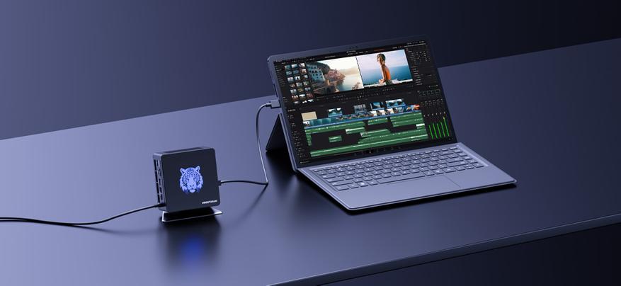 Аккумуляторная батарея на 50 Втч позволяет работать процессору на полной мощности до двух часов, а в экономичном режиме — еще больше. Несмотря на то, что процессор AMD Ryzen 7 8840U мощный, его потребление составляет 28 Вт (TDP). Корпус полностью металлический (магниевый сплав) и дополнительно позволяет отводить тепло от процессора. Внутри установлена система охлаждения на медных тепловых трубках. Для детальной настройки системы используется оригинальное программное обеспечение MINISFORUM VSPACE Control Center.