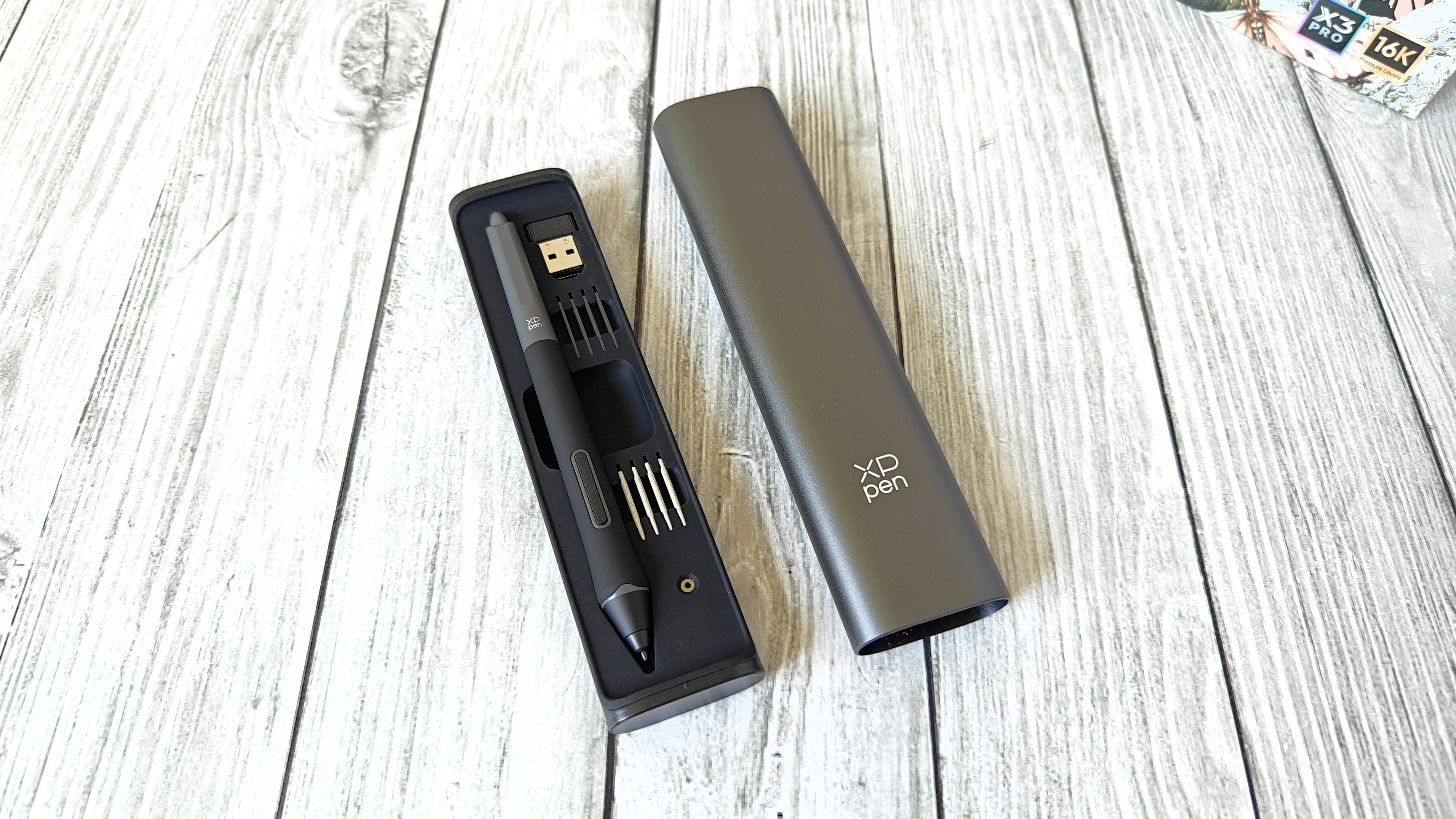 Кейс со стилусом такой же, как и у обозреваемой мною модели XP-Pen Artist Pro 16 первого поколения. Корпус из металла, стильный, с указанием бренда на лицевой стороне. Открывается как слайдер. Нажимаем на торец и внутренняя часть выезжает из корпуса пенала. Внутри стильный стилус последнего поколения, комплект запасных грифелей и USB передатчик для беспроводного пульта.