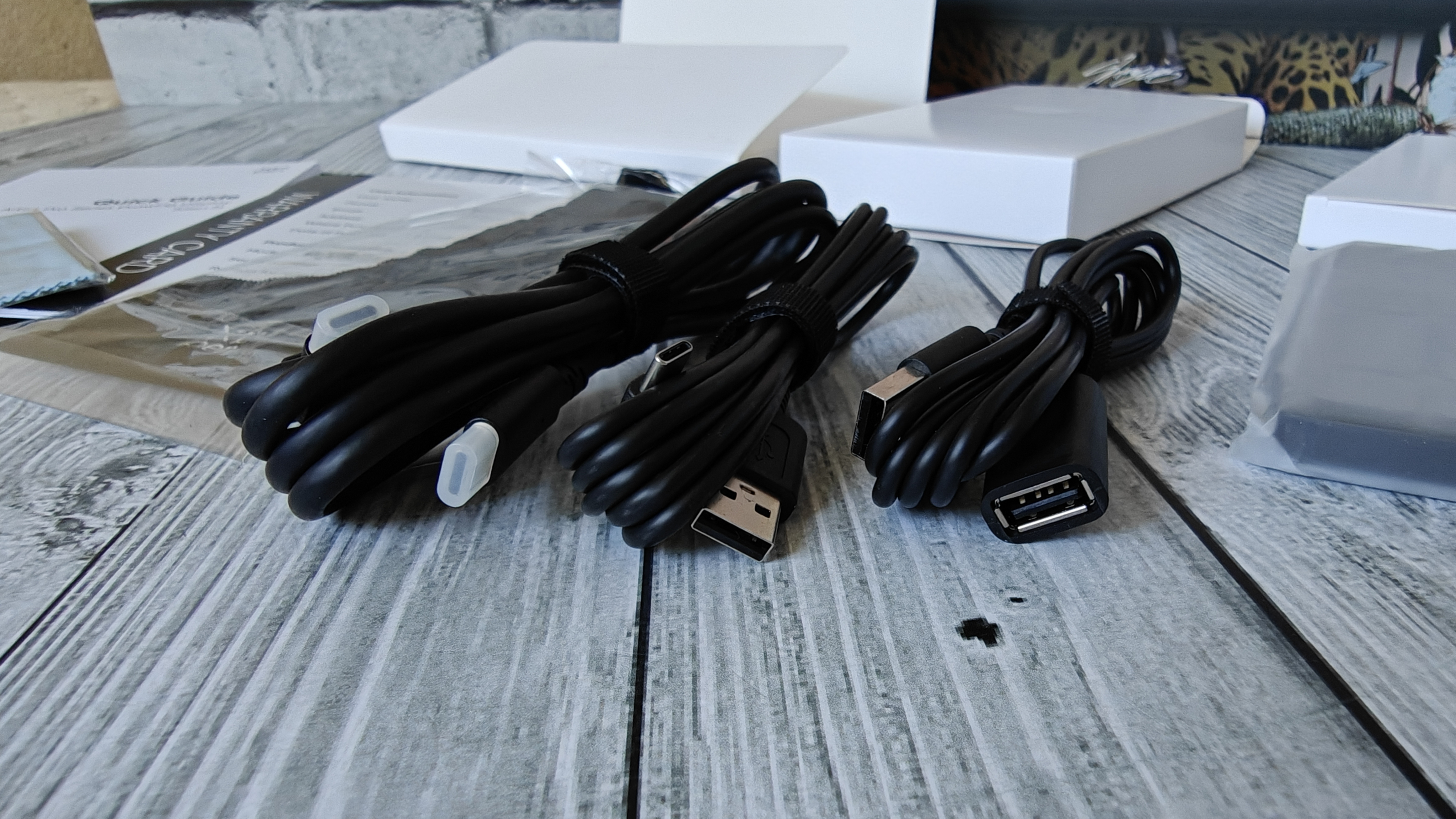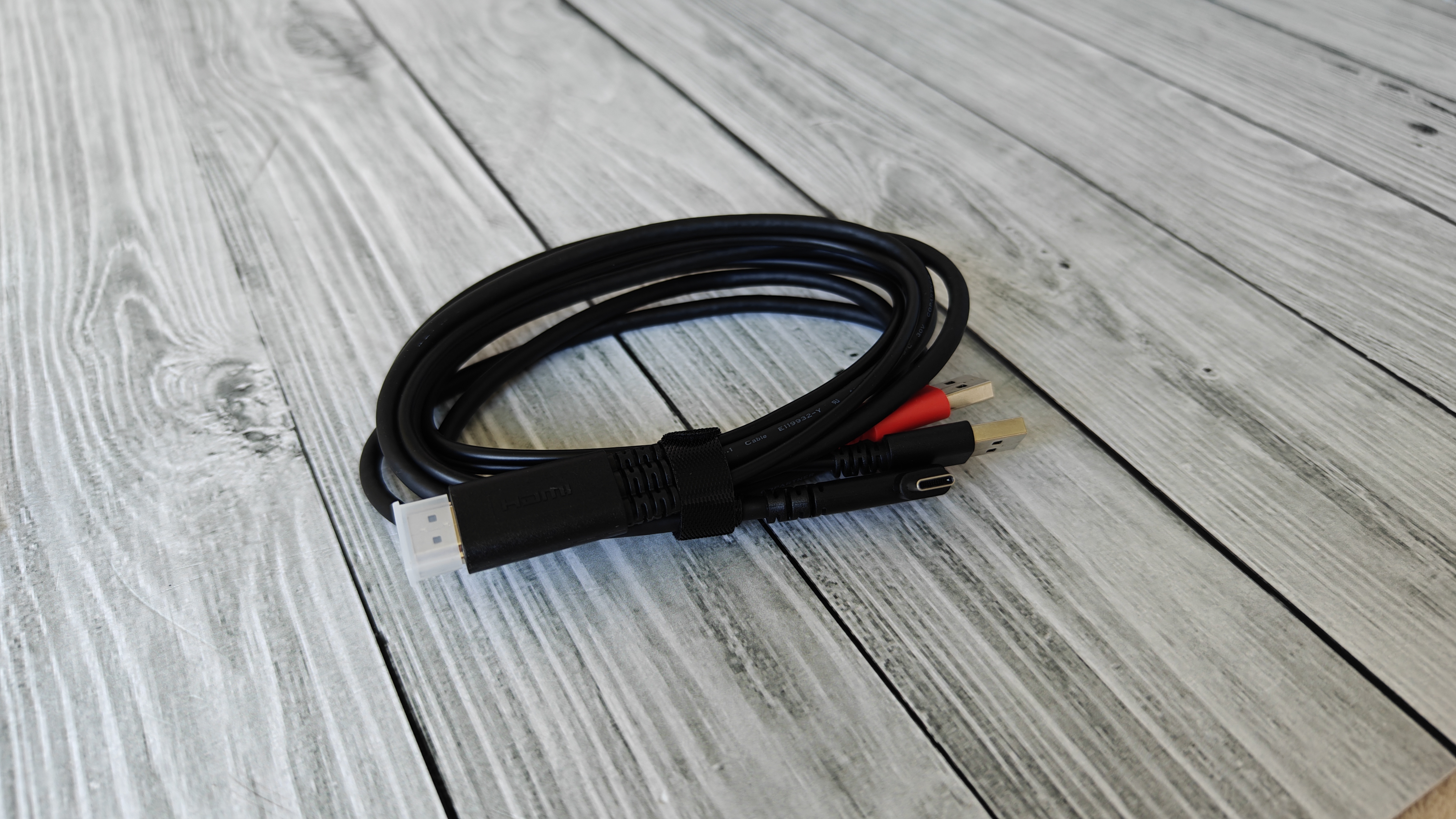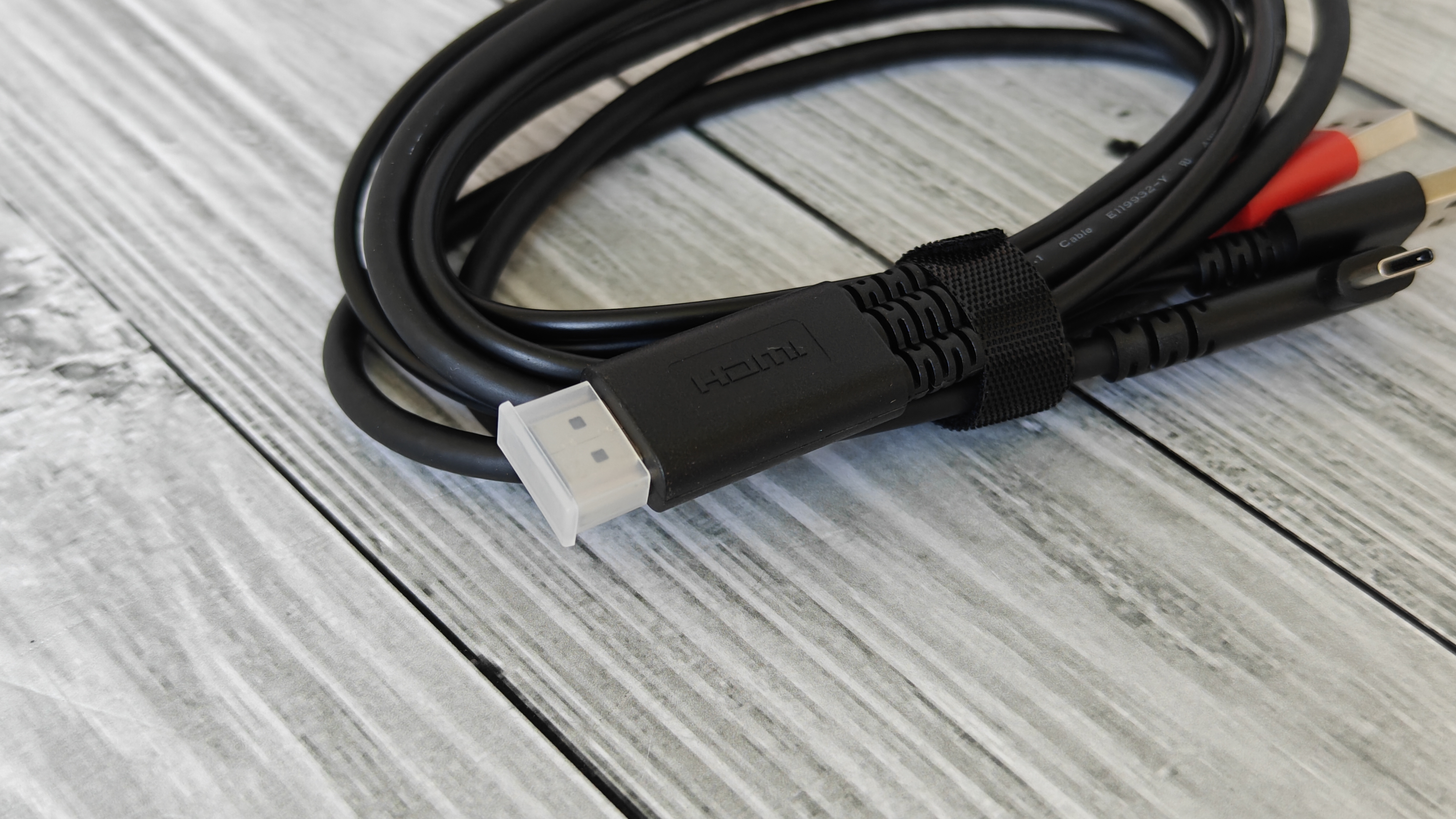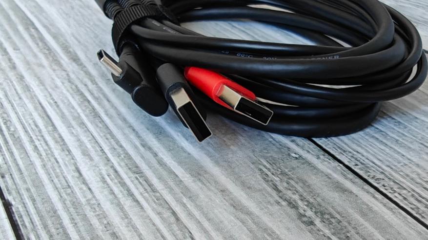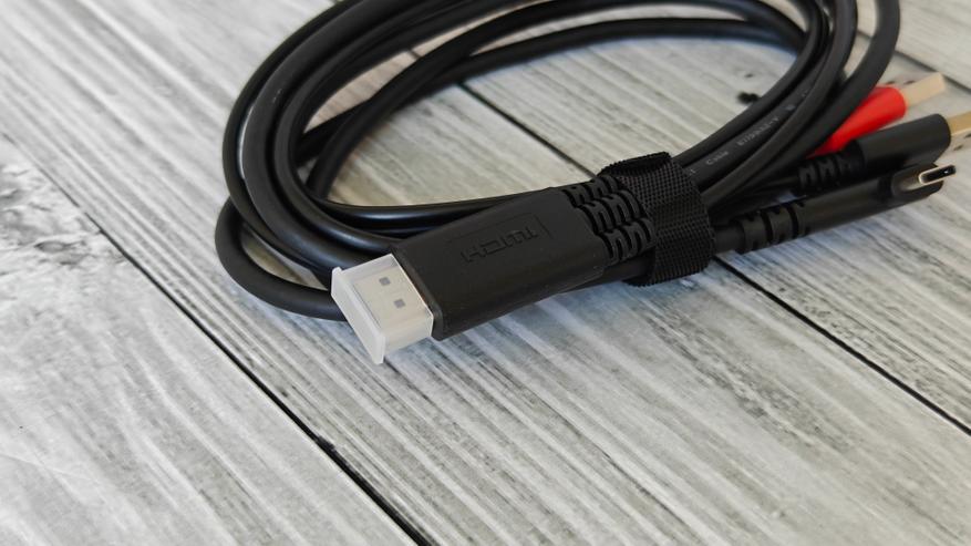 В отдельной коробке положили кабель 3в1 для подключения устройства. Он имеет HDMI разъем с одной стороны, 2х USB разъема и 1х Type-C разъем с другой стороны. USB разъемы для питания и передачи данных выделены разными цветами.