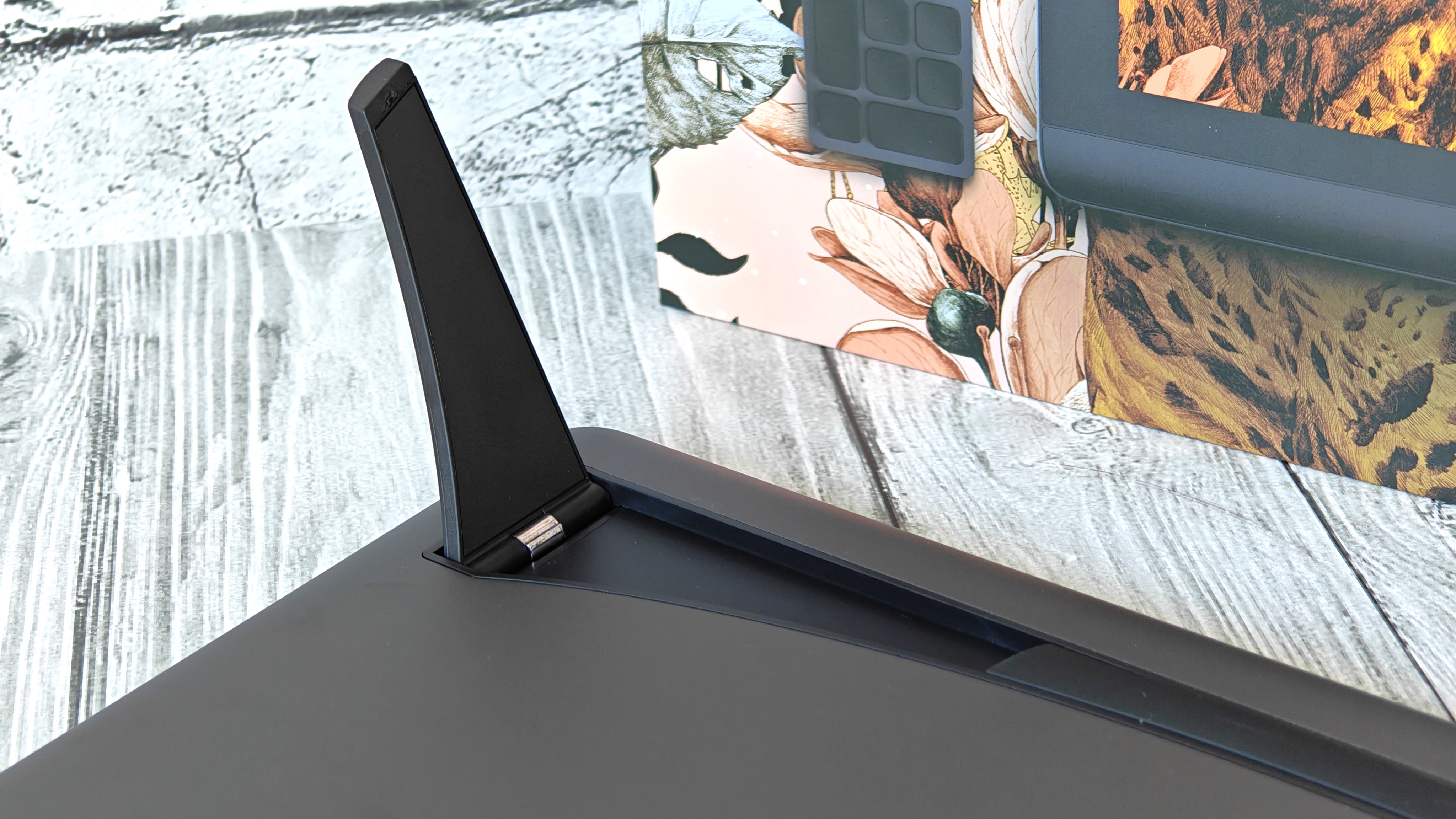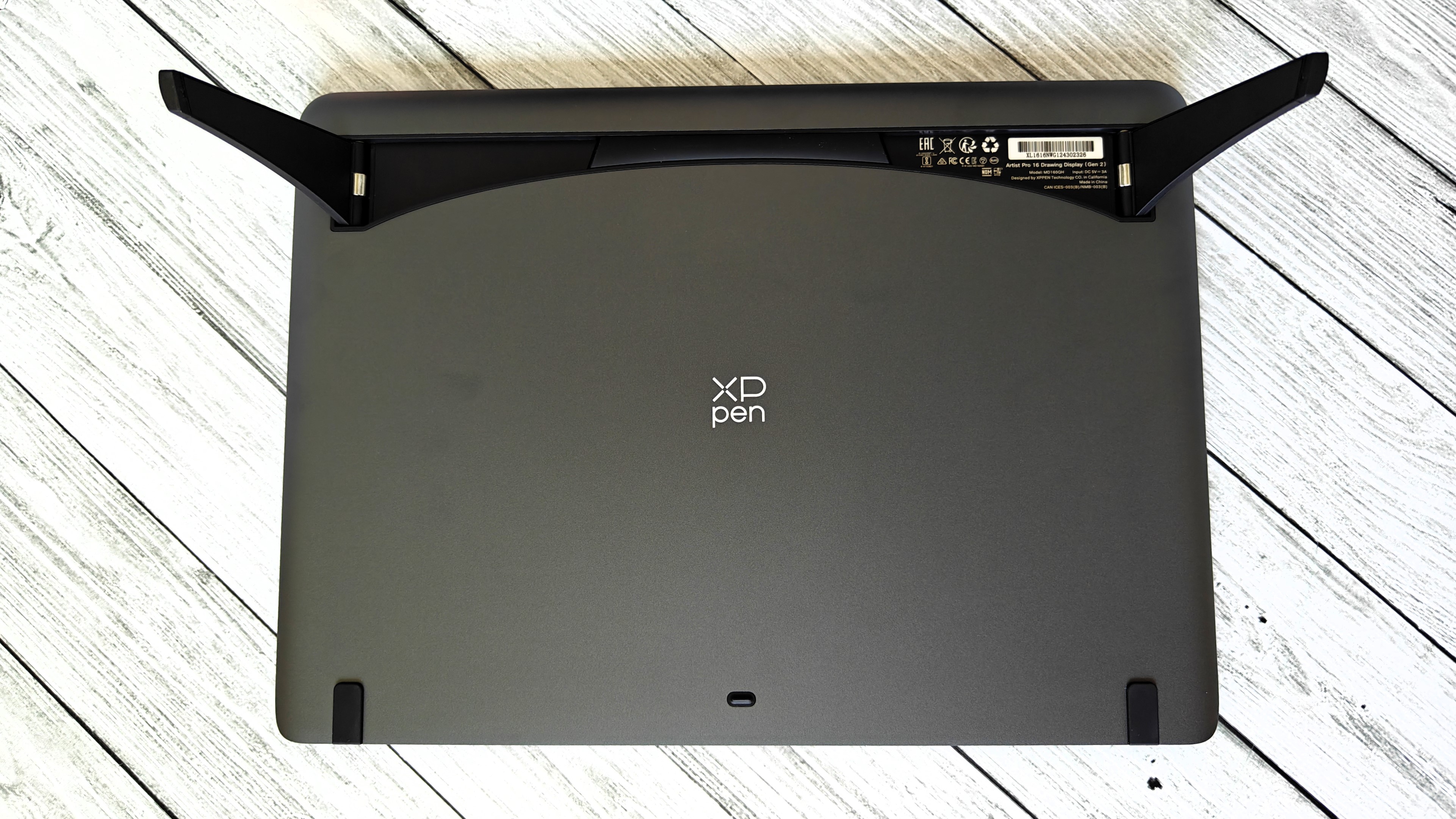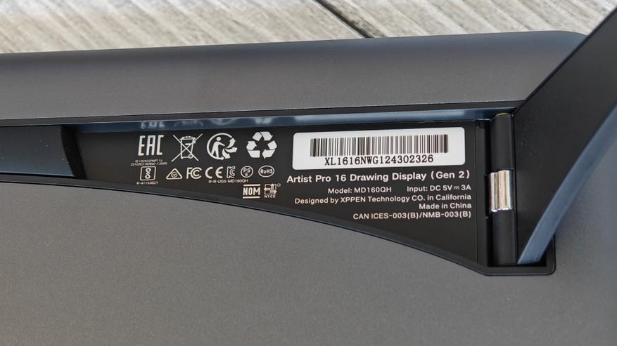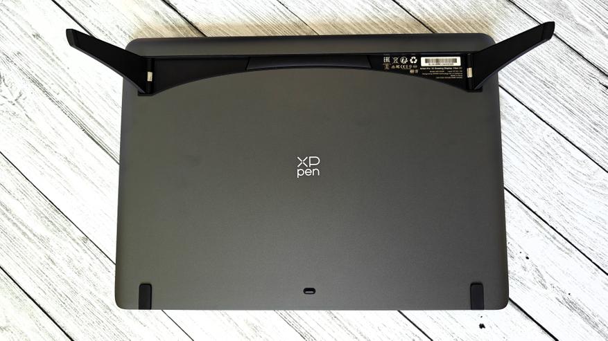 Модель графического планшета подписана под ножкой. Шарниры ножек — металлические. Ножки имеют 2 точки фиксации.