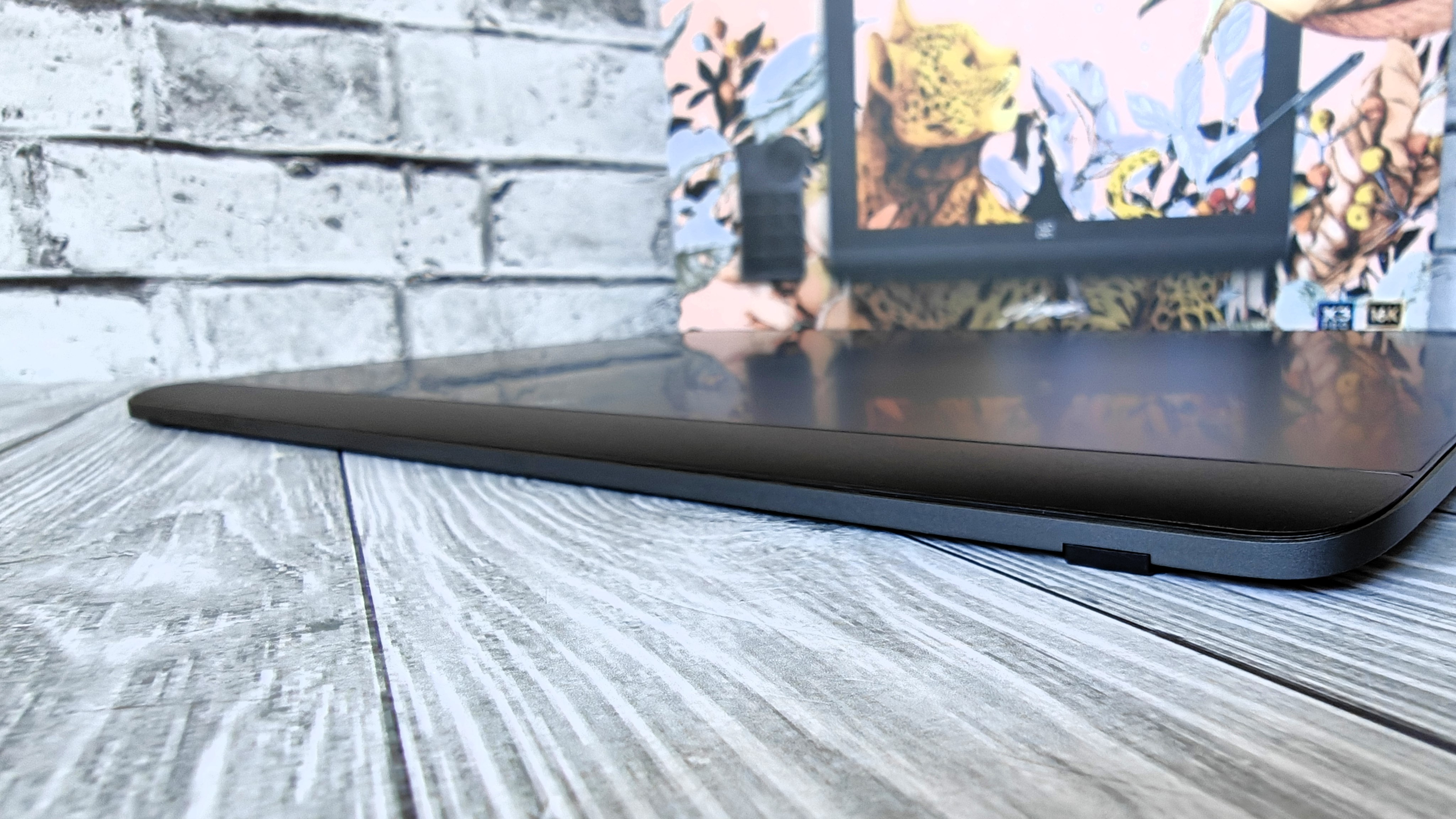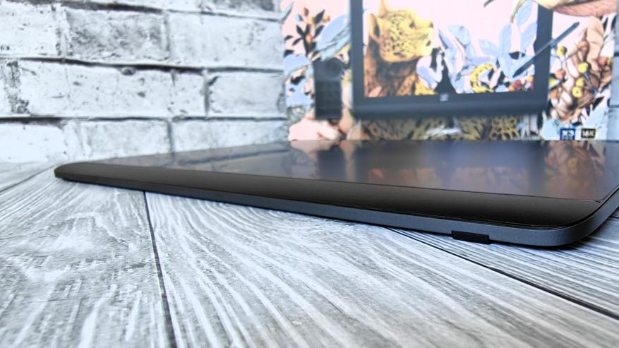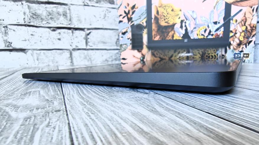 Планшет действительно большой. WQXGA дисплей с диагональю 16″ и разрешением 2560x1600 закрывает не все пространство. Есть достаточно большие рамки. Под дисплеем расположен логотип производителя и еще ниже плавный пластиковый свод.