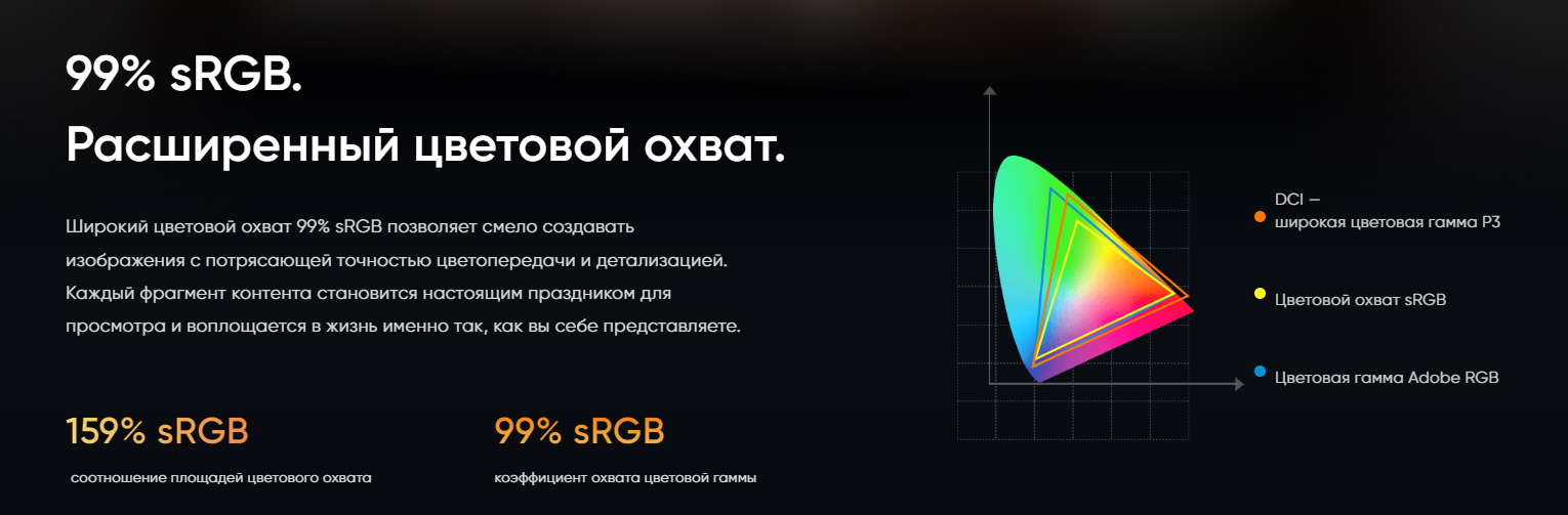 | Соотношение площадей цветовой гаммы (типичное) | 159 % sRGB, 118 % Adobe RGB, 117 % DCI-P3 |