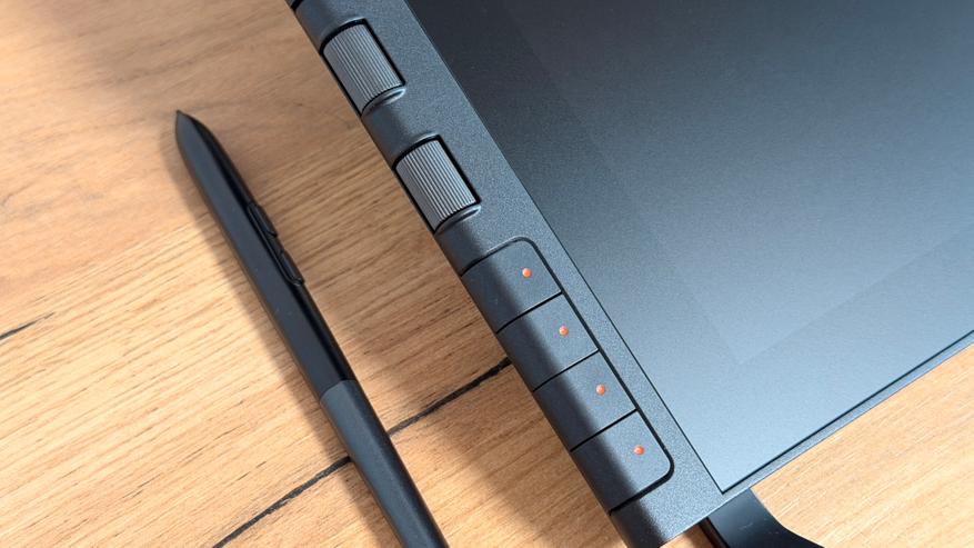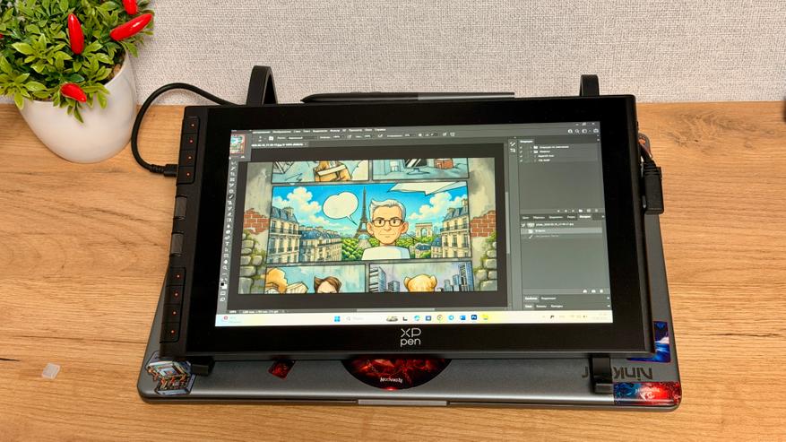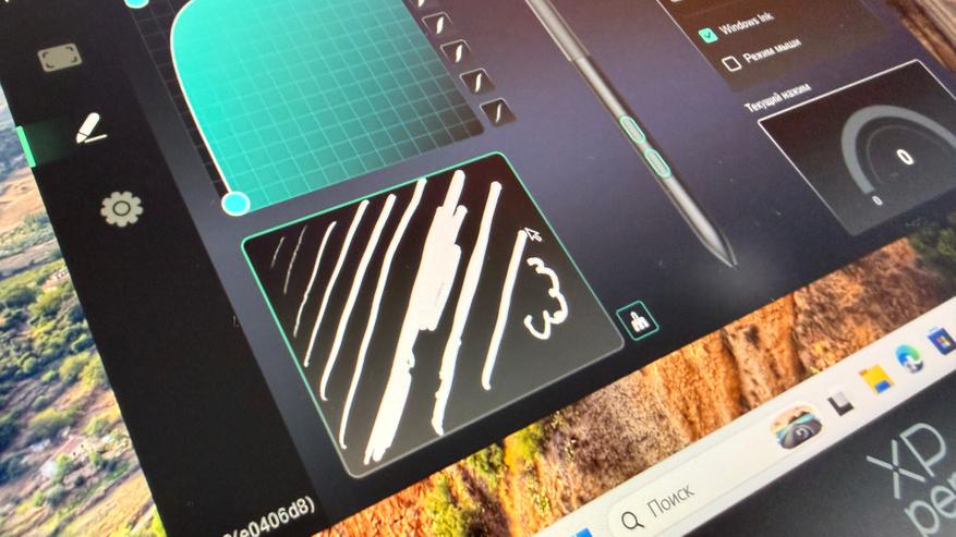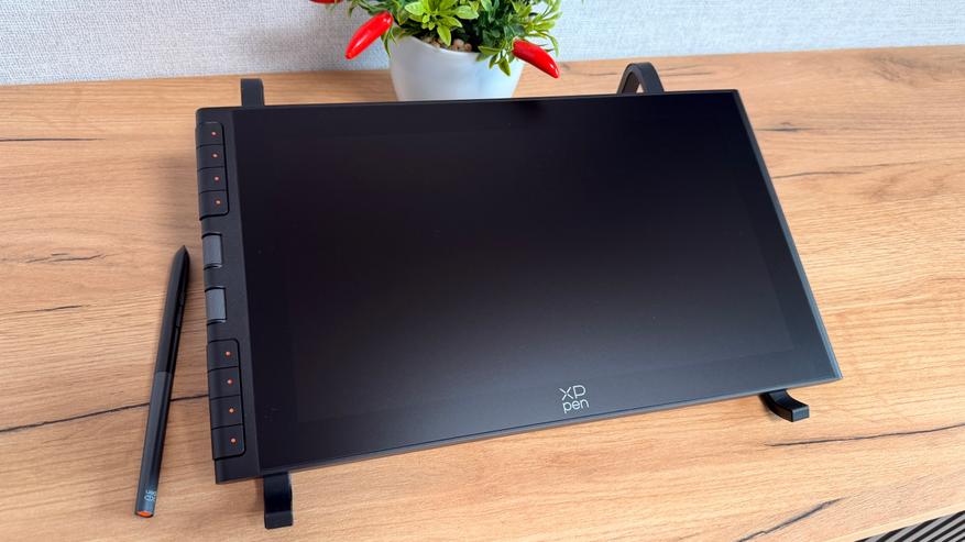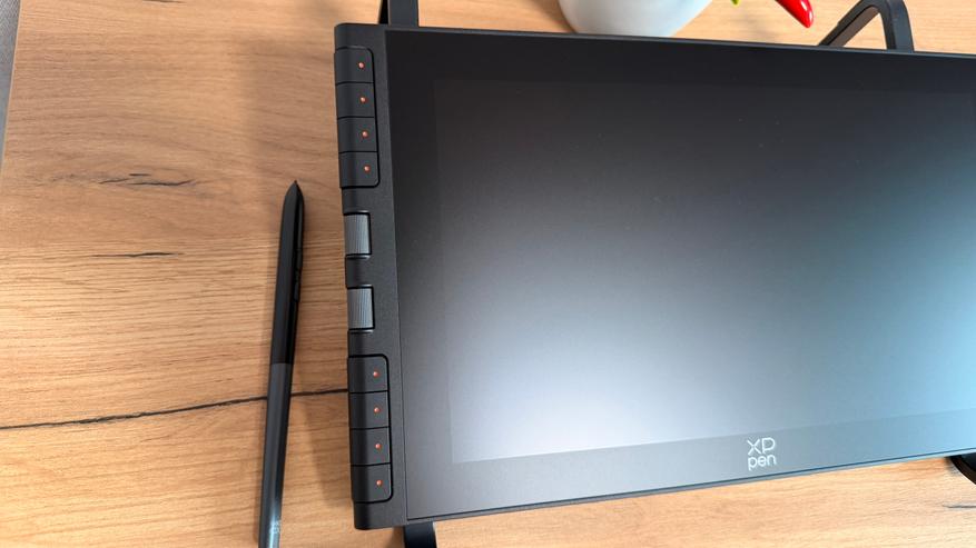 Слева от дисплея расположили блок полностью настраиваемых кнопок, которые даже из коробки настроены довольно интересно. Главная особенность модели — это инновационные колеса прокрутки X-Dial. Два удобных колёсика, встроенных в корпус планшета. Они позволяют мгновенно управлять масштабом — приближать или отдалять картину — или менять толщину кисти одним лёгким поворотом. Всё сделано так, чтобы рука оставалась в естественном положении, а творческий процесс не прерывался на поиск меню или горячих клавиш. Благодаря чётким тактильным щелчкам при вращении я всегда чувствую точное положение, а настройка происходит интуитивно и быстро. Это не просто дополнение — это способ сделать работу быстрее и комфортнее, особенно когда нужно часто зумить или корректировать размер штриха. После недолгого привыкания такой контроль становится незаменимым для сохранения потока и концентрации. Оба колёсика, как и восемь боковых кнопок, полностью настраиваемы в драйвере XP-Pen: назначьте на них вместимость, вращение холста, переключение слоёв, инструменты или любые другие команды под ваш любимый софт.