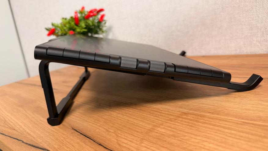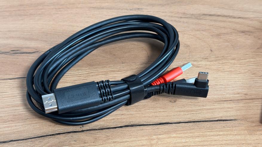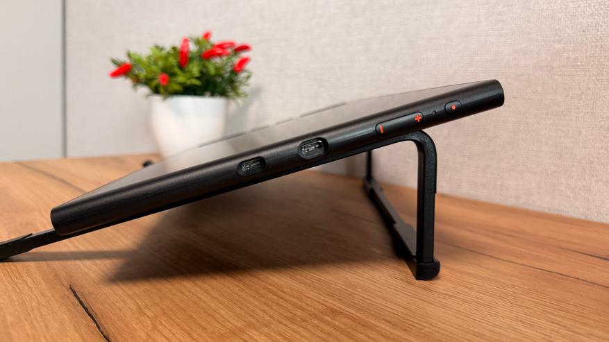 - Нижний — специализированный 3-в-1 USB-C порт, предназначенный исключительно для комплектного многожильного кабеля (L-образный USB-C на планшете → HDMI + чёрный USB-A для данных + красный USB-A для доп. питания). Используется в случаях, когда у компьютера нет подходящего USB-C с видео-поддержкой — классический способ через HDMI.