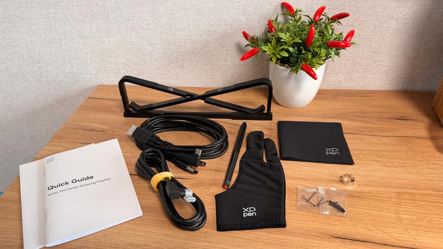 В комплекте есть все, что нужно для успешной работы. Во-первых, полный комплект кабелей. Для универсального использования с любым устройством есть традиционный кабель 3в1, который и передает питание через USB и изображение через HDMI. А также устройство может подключать одним кабелем Type-C к устройствам, которые умеют передавать и питание и изображение через этот интерфейс. Во-вторых, в комплекте интеллектуальный стилус X4, которые смогли уже оценить многие пользователи. В-третьих, есть салфетка и перчатка для комфортного рисования. Для стилуса есть комплект сменных грифелей и клиппер для их удаления. В-четвертых, в комплекте есть удобная складная подставка.