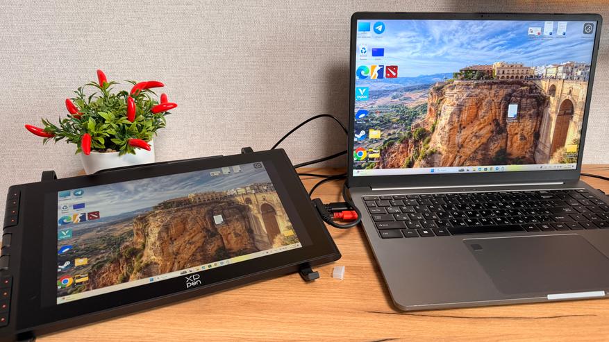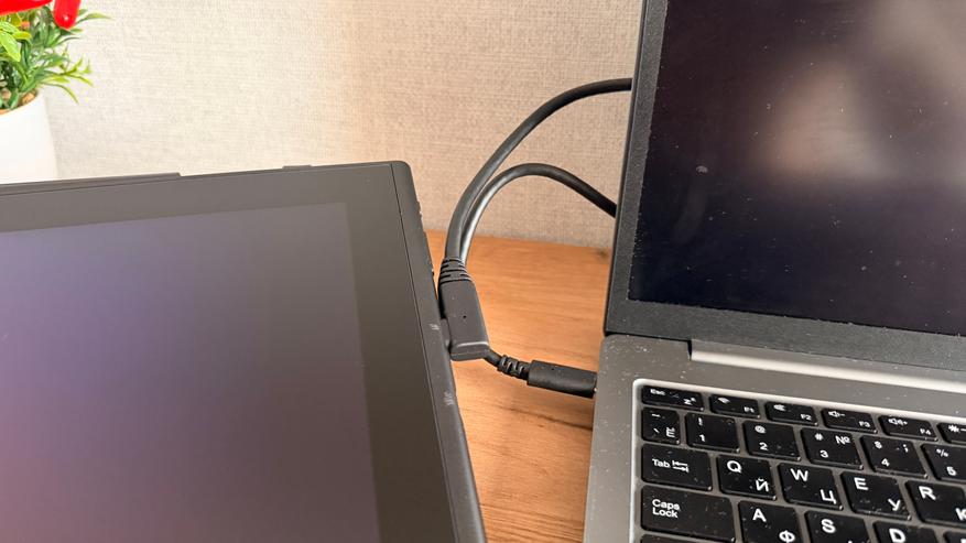 Подключение планшета максимально простое. Можно кабелем 3в1, если ваш ПК не может передавать изображение с Type-C порта, разумеется, для ноутбука удобнее подключение одним кабелем.
