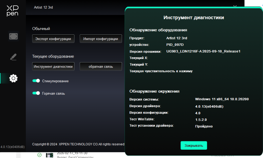 Для полноценной настройки необходимо скачать специальное приложение с официального сайта. Версия XPPenWin4.0.13.251216 — актуальная (на начало 2026), идеально заточенная под Artist 12 3rd с X-Dial.