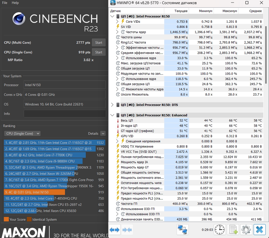 Cinebench R23 выдает 2777 очков в режиме Multi Core и 919 очков в режиме Single Core. Для энергоэффективного процессора вполне себе неплохо. Что примечательно — средняя температура во время тестирования не поднималась выше 66 градусов.