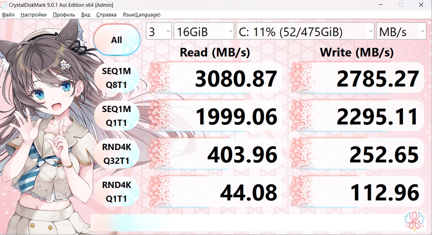 CrystalDiskMark показал 3080 МБ/с на чтении и 2785 МБ/с на записи — неплохо, даже очень. Особенно учитывая ценовую категорию устройства.