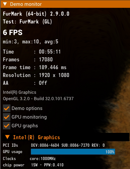 FurMark за почти часовое тестирование выдал в среднем 5 FPS (кадры в секунду) в режиме Full HD. Сказать, что этого мало — ничего не сказать, однако синтетические тесты не совсем подходят для такого уровня встроенного видеоядра. И это стоит держать в голове как при выборе устройства, так и при самостоятельном тестировании в бенчмарках.