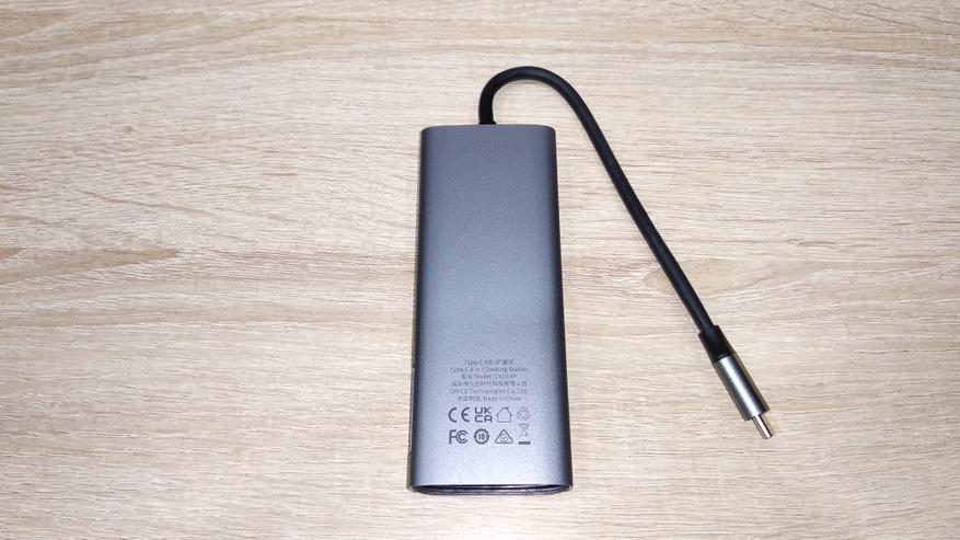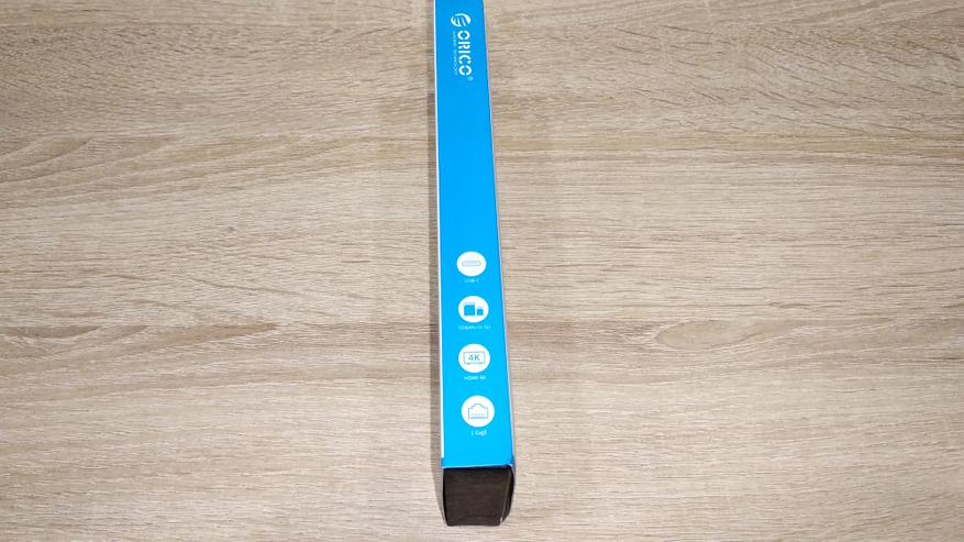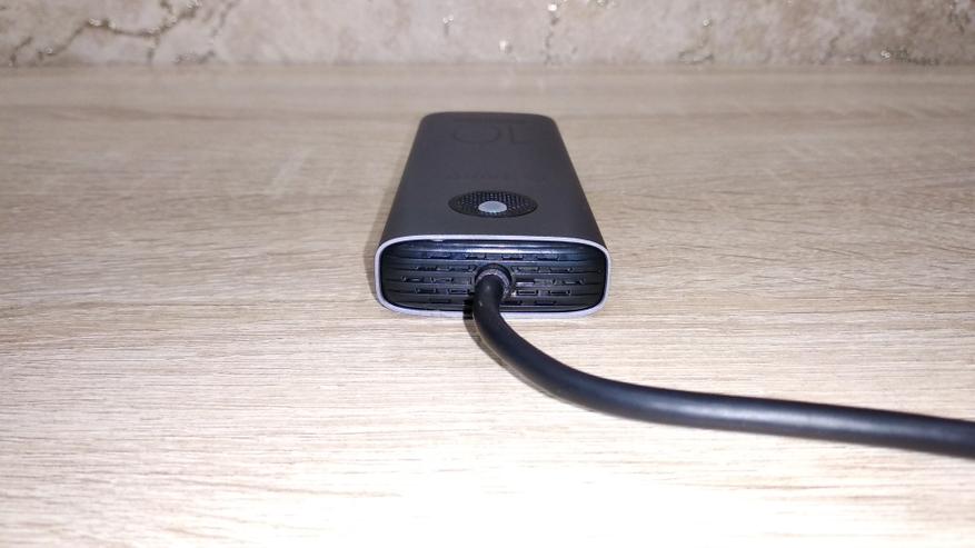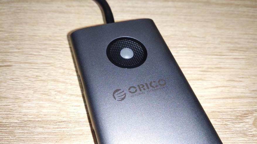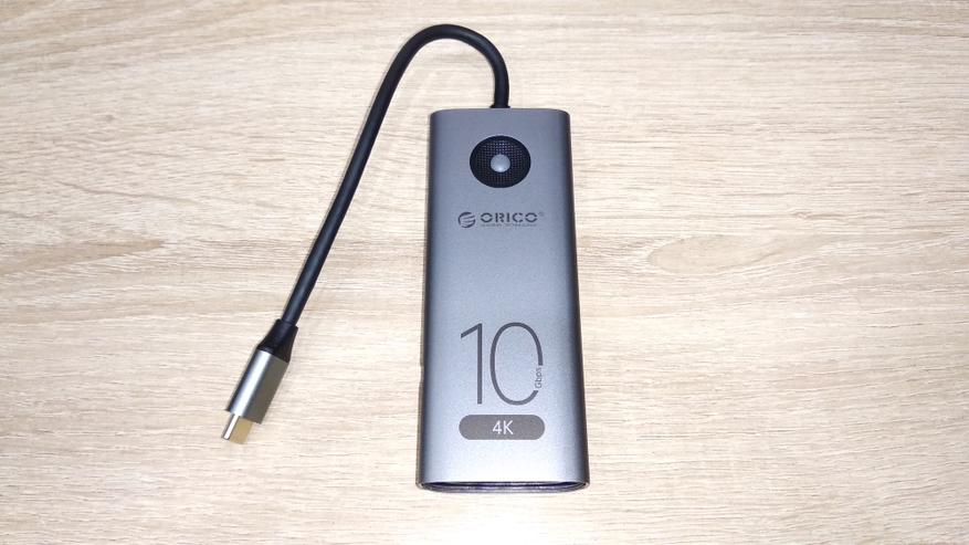 Продолговатый алюминиевый корпус очень похож на другие подобные устройства. Нового тут сложно что-то придумать, да и не за чем. Кабель несъемный, это одновременно и плюс и минус. Плюс в том, что такой вариант мне видится надёжнее, минут в том, что замена потребует больше усилий, чем простая замена. В центре корпуса есть логотип фирмы, под ними большое по размеру число «10», скорее всего символизирующее 10 Гбит интерфейс USB, под ним 4K — это разрешение, которое поддерживается на разъеме HDMI. Над логотипом есть какой-то кружок, который будет светиться. Возможно, это единственное, что отличает данный док от, наверняка уже существующий в ассортименте ORICO.