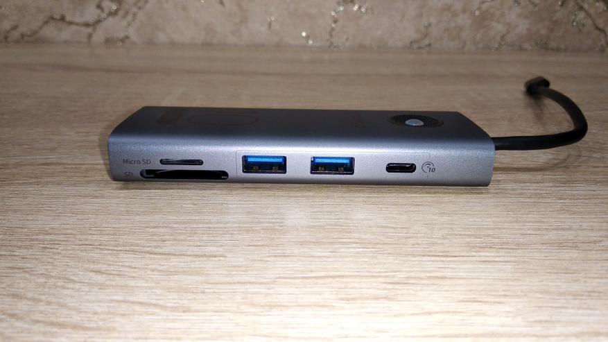 Интерфейсы находятся на длинных торцах. На левом: USB C 3.2 gen2 с поддержкой PD 100 Вт, HDMI с поддержкой 4K60, гигабитная проводная сеть. На правом торце: SD и MicroSD картоводы, 3 порта USB 3.2 gen2, один из которых Type-C. Т. е у данной док-станции интерфейсов, как у современного ноутбука, хотя даже больше, сейчас все реже встречается карт-ридер, не говоря о проводной сети.