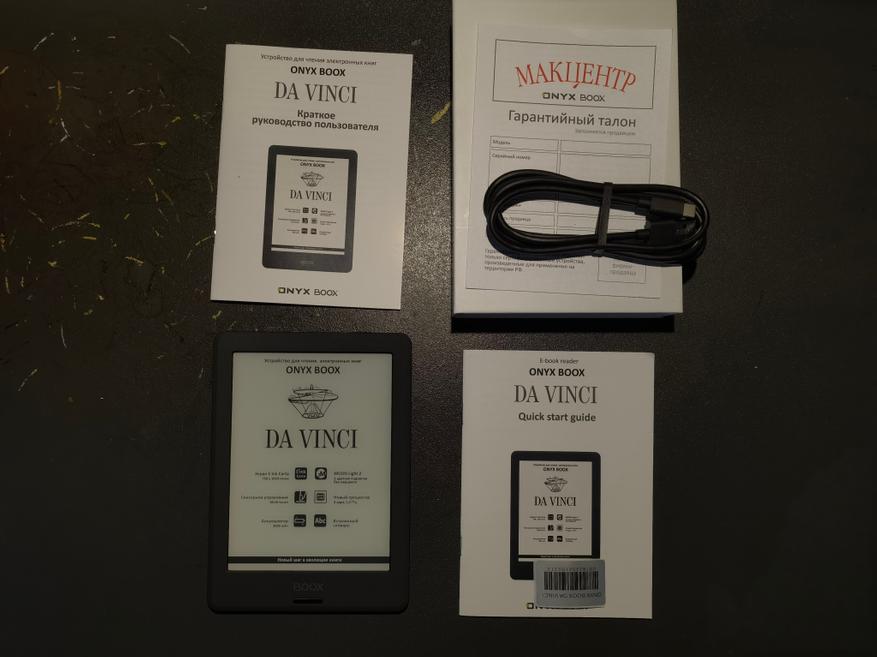 В комплект поставки входит книга с электронными чернилами Da Vinci, кабель для заряда USB-A USB-C, инструкция и гарантийный талон официального дистрибьютора Onyx Boox в России, МакЦентра.