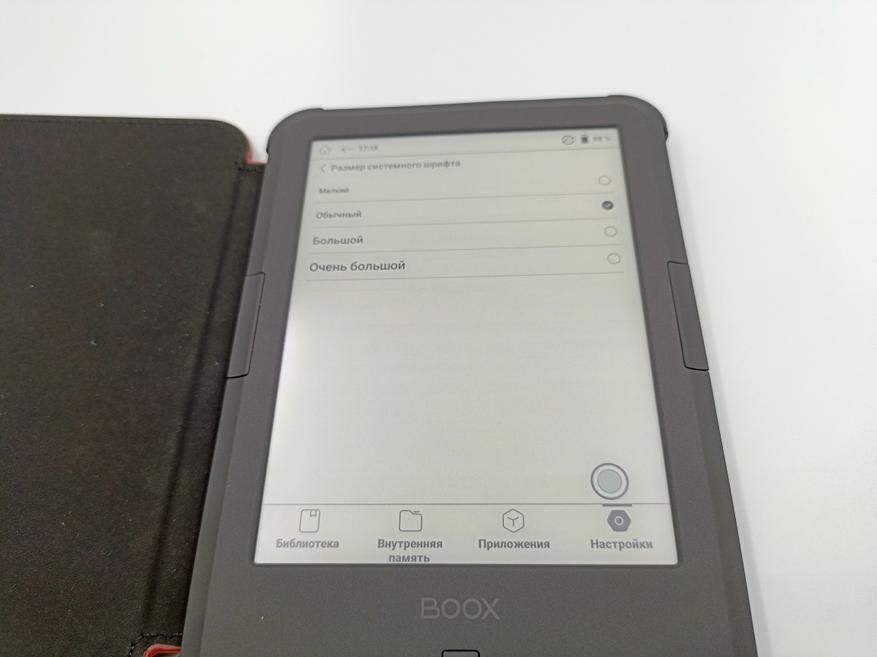 В книжке ещё есть множество настроек: от выбора параметров энергопотребления до переназначения всех кнопок под свои задачи. Если вам не нравится управлять кнопками, настройте управление жестами. Для людей с плохим зрением на выбор предоставлено четыре варианта шрифтов разного размера. Этот шрифт служит, только для отображения в меню (по другому — системный шрифт). В режиме чтения книги вы можете установить свой шрифт, который вам больше всего нравится.