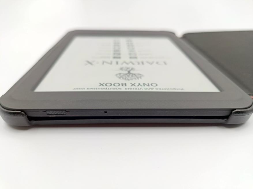 ONYX BOOX Darwin X имеет стильный и современный дизайн, выполненный в пластиковом корпусе черного матового цвета. Размеры устройства составляют: ВхШхТ 170x117x8,7 мм, а вес — всего 270 грамм. Без чехла книжка легче и весит на 50 грамм меньше. Компактные размеры и легкий вес делает эту модель книги удобной для переноски и использования в любом месте. Чехол сделан очень качественно. Все аккуратно прошито. Чехол защищает книжку полностью со всех сторон, а при закрытии переводит книгу в спящий режим.