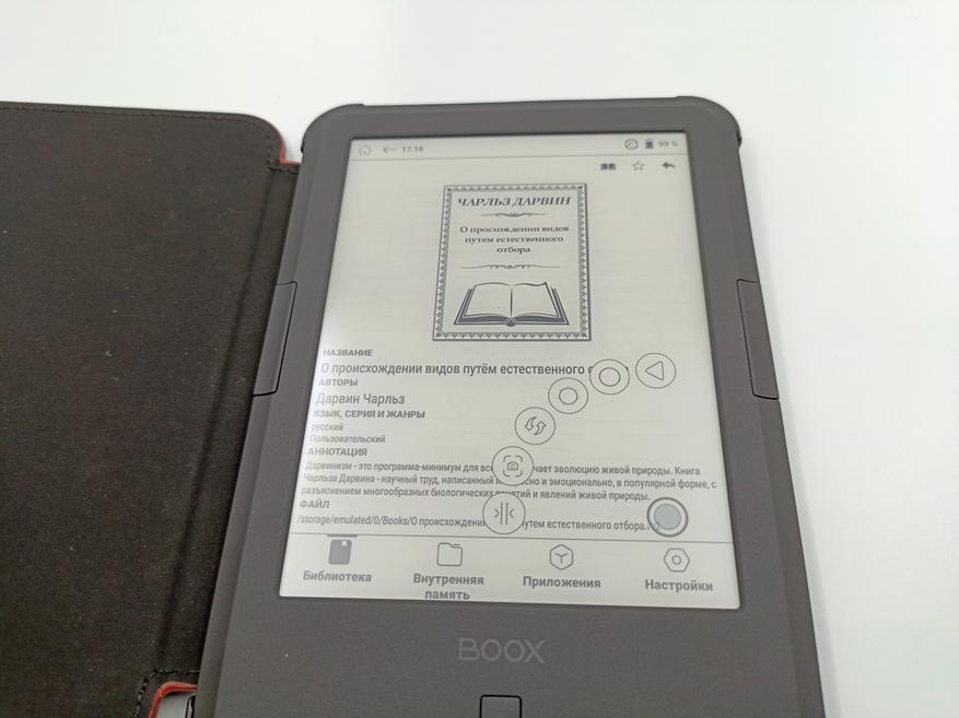 Все книжки находятся в разделе «Библиотека» Удобно отсортированы. Можно быстро продолжить читать начатую книгу ранее, и вы всегда будете знать, сколько вам осталось ещё до последней страницы. Причем показывается не только номер страницы, но и общий процент прочтения книги. Бонусом пишется рядом состояние аккумулятора в процентах и текущее время.